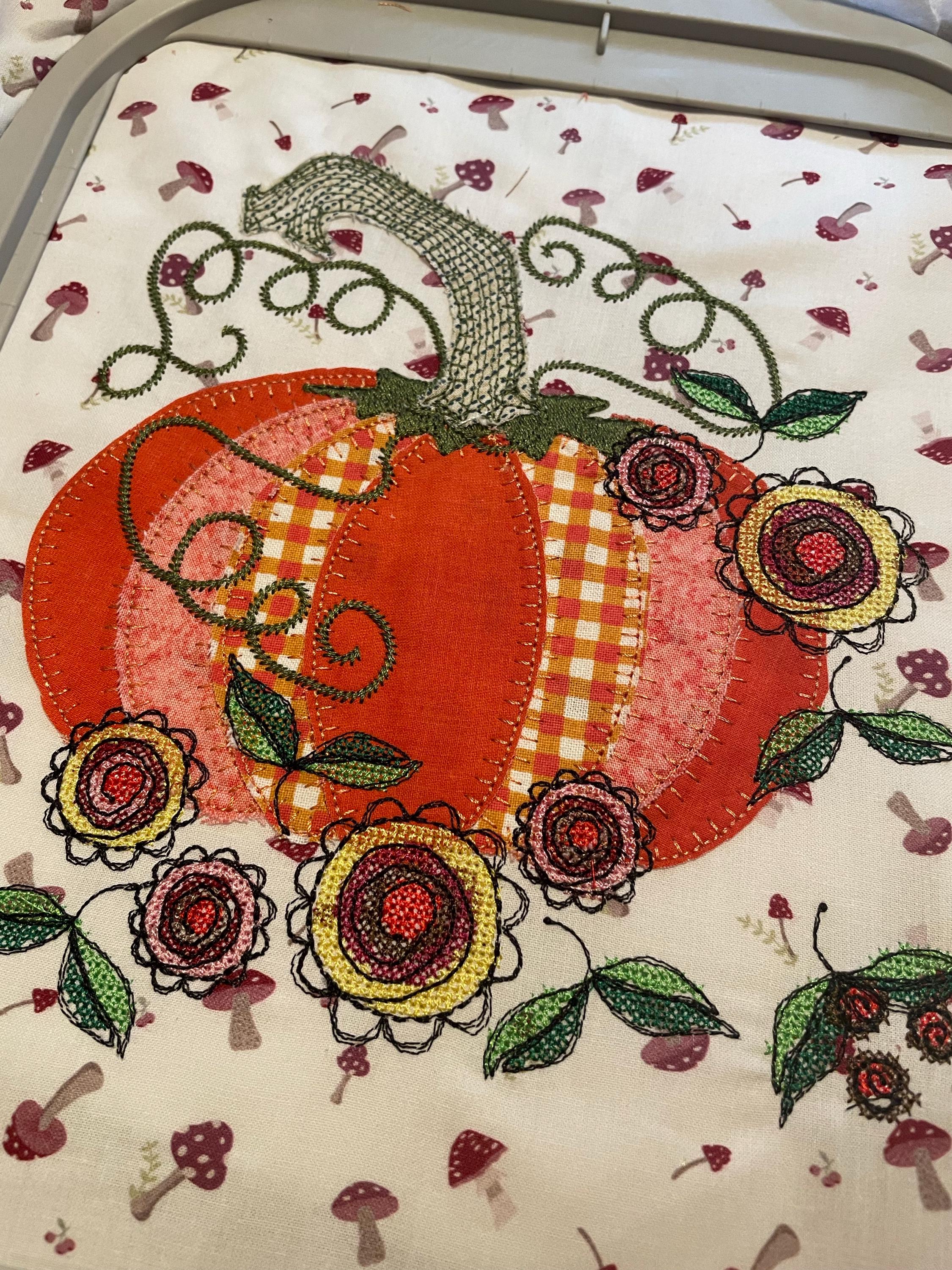 Hand drawn Appliqué Pumpkin with doodle-ish cross stitch flowers to make on your embroidery machine