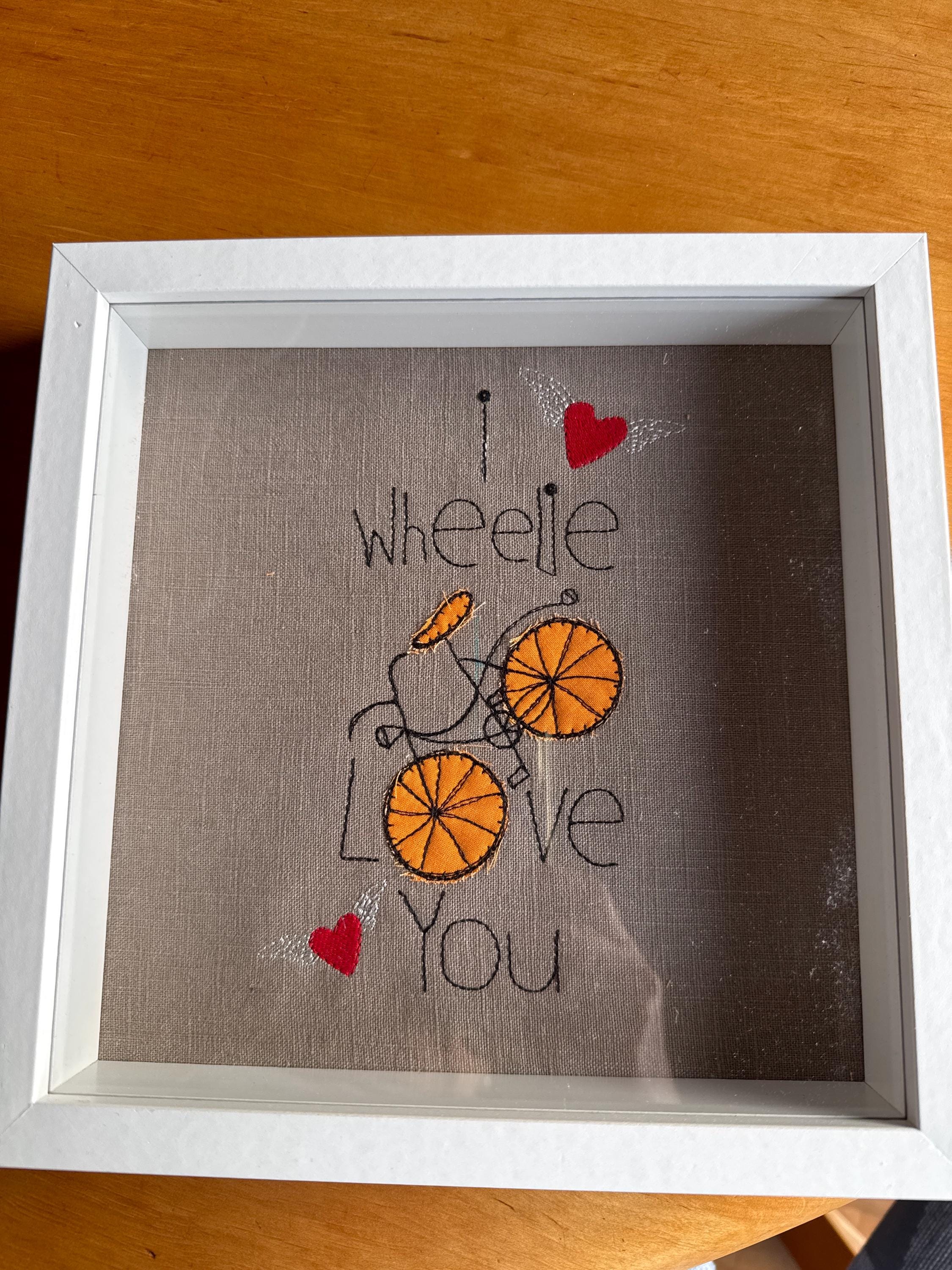 Sketchy Bike with appliqué wheels to make on your embroidery machine - a love declaration with a cute hand drawn bike as the center of the design - for bike lovers and others who know the benefits of bike riding :-)