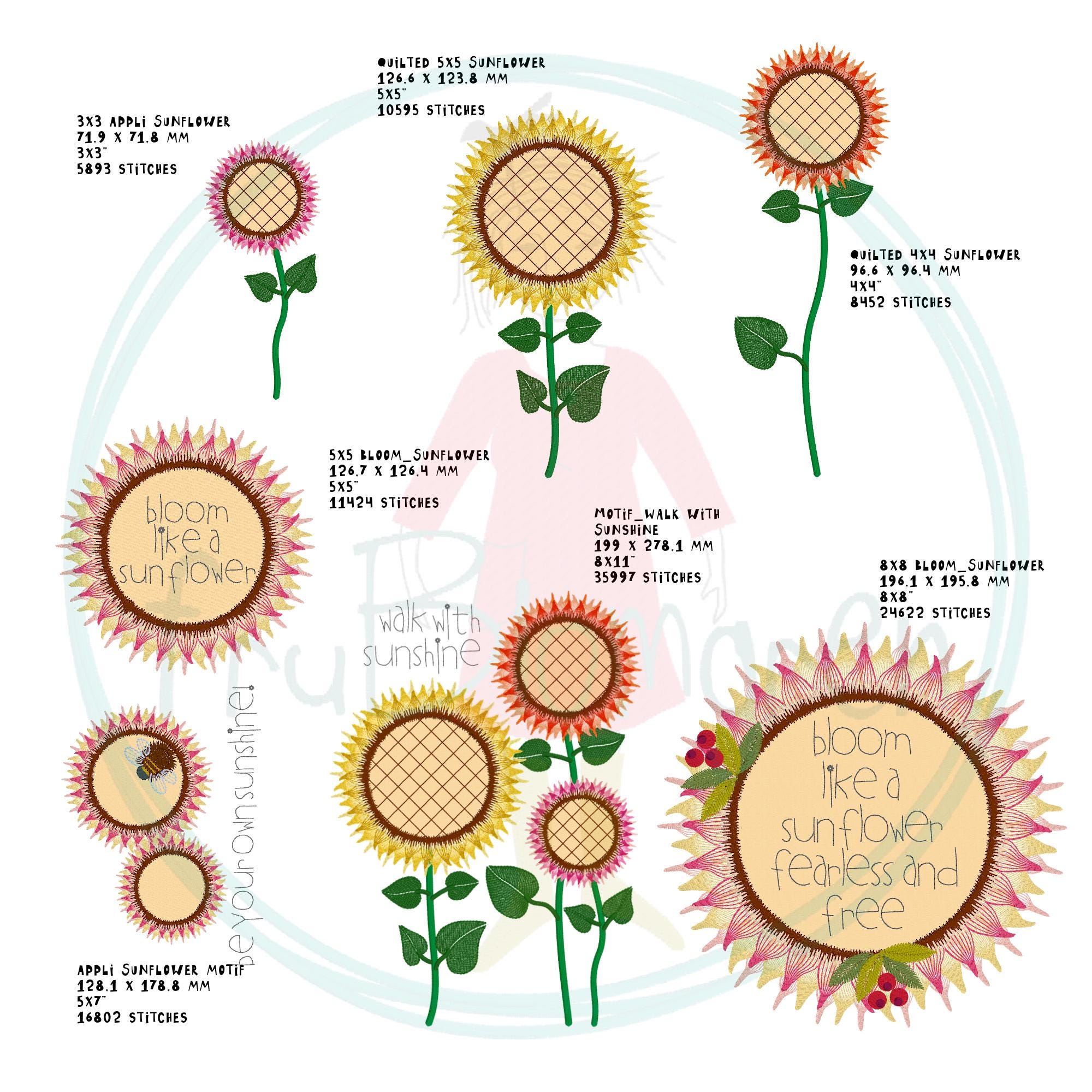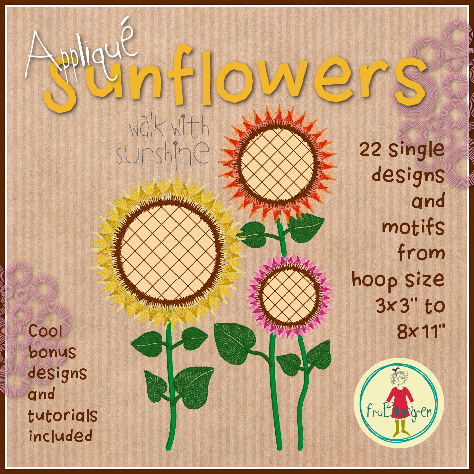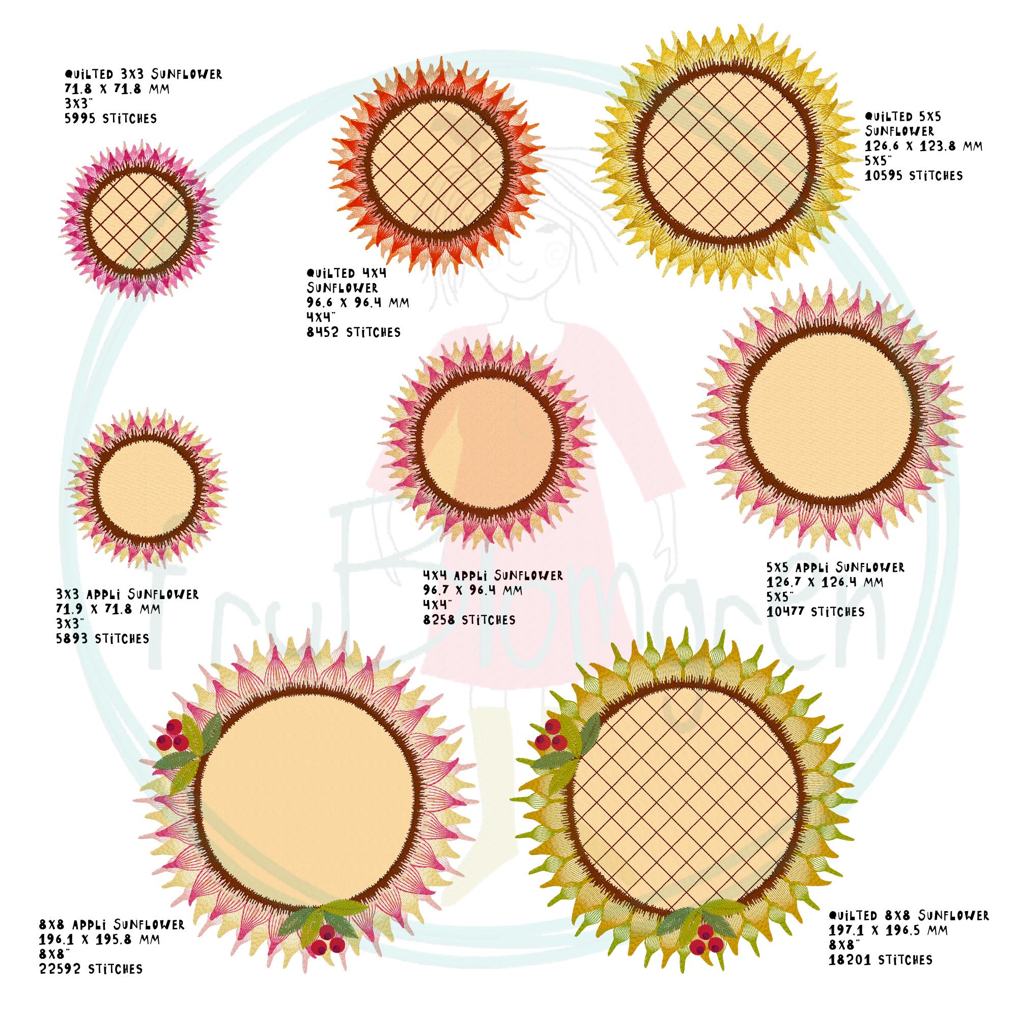 AppliquĂŠ sunflowers in hoops 3x3" to 8x11"