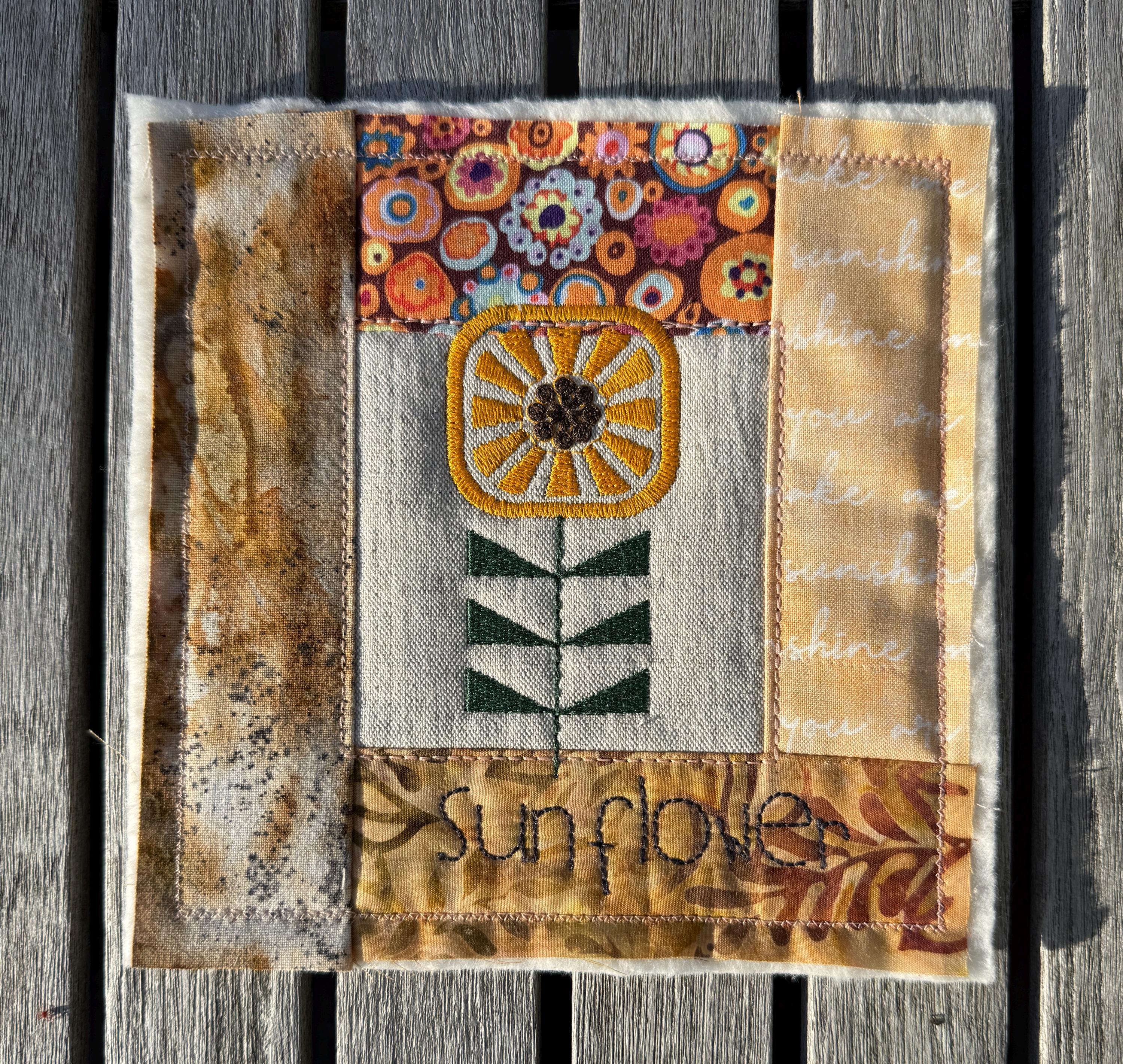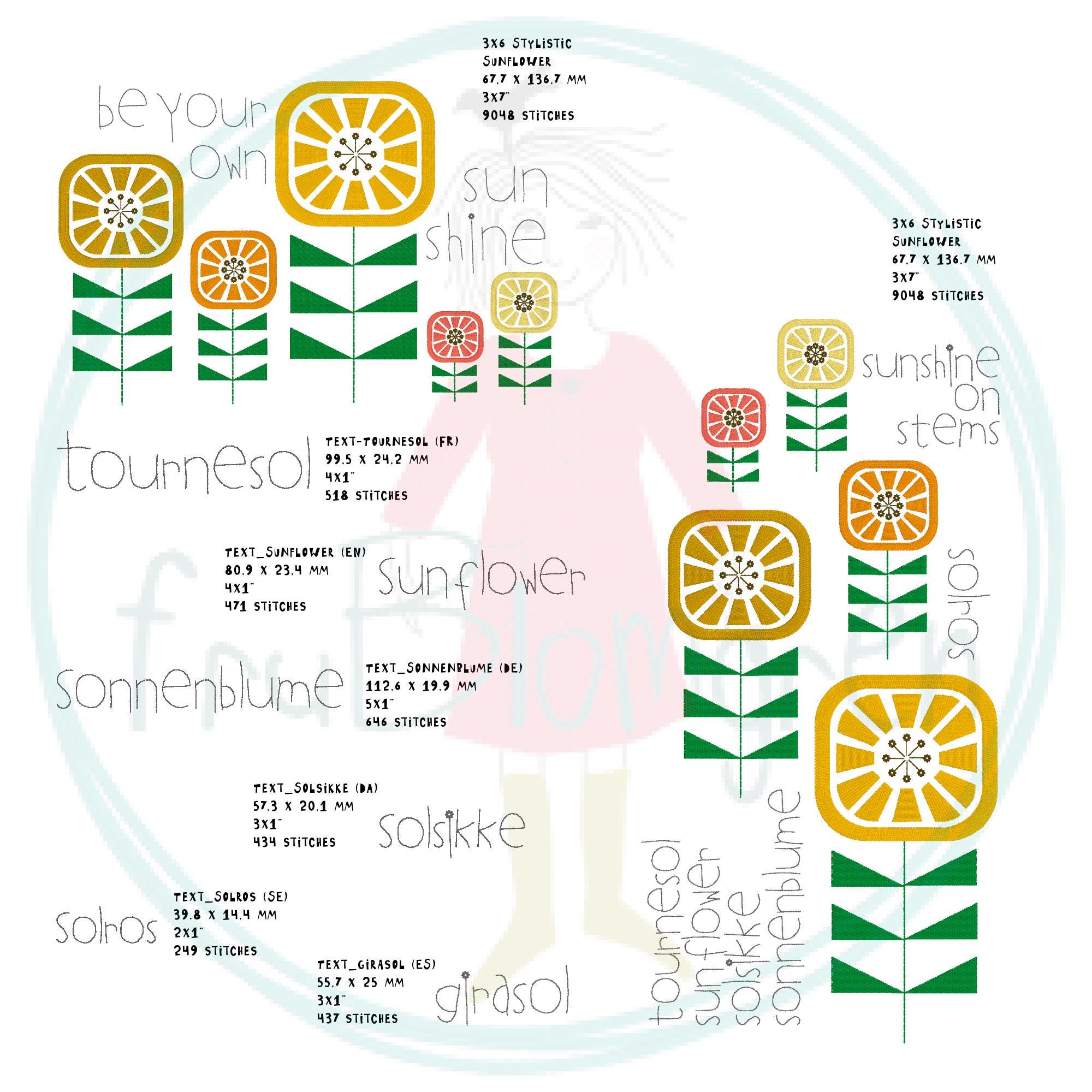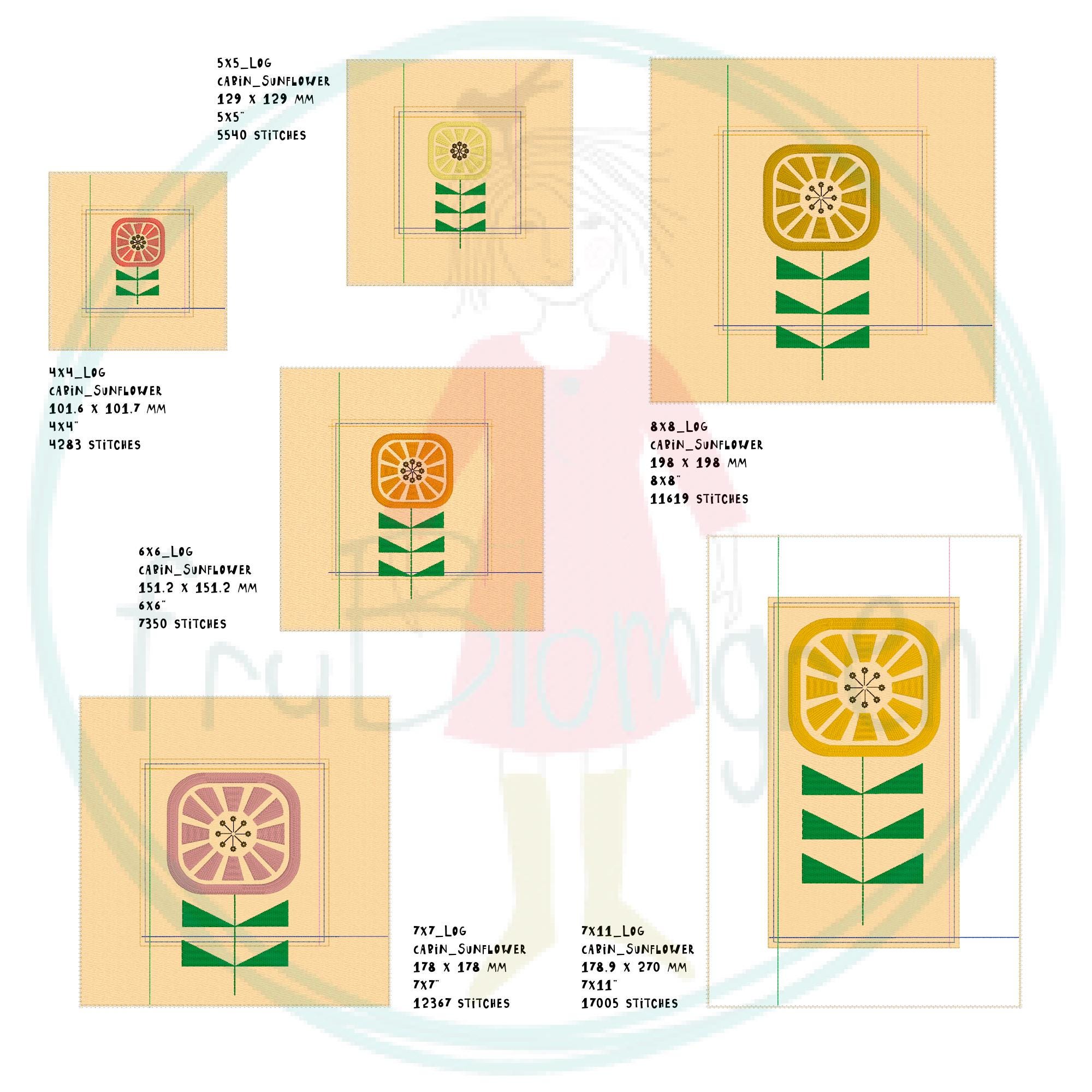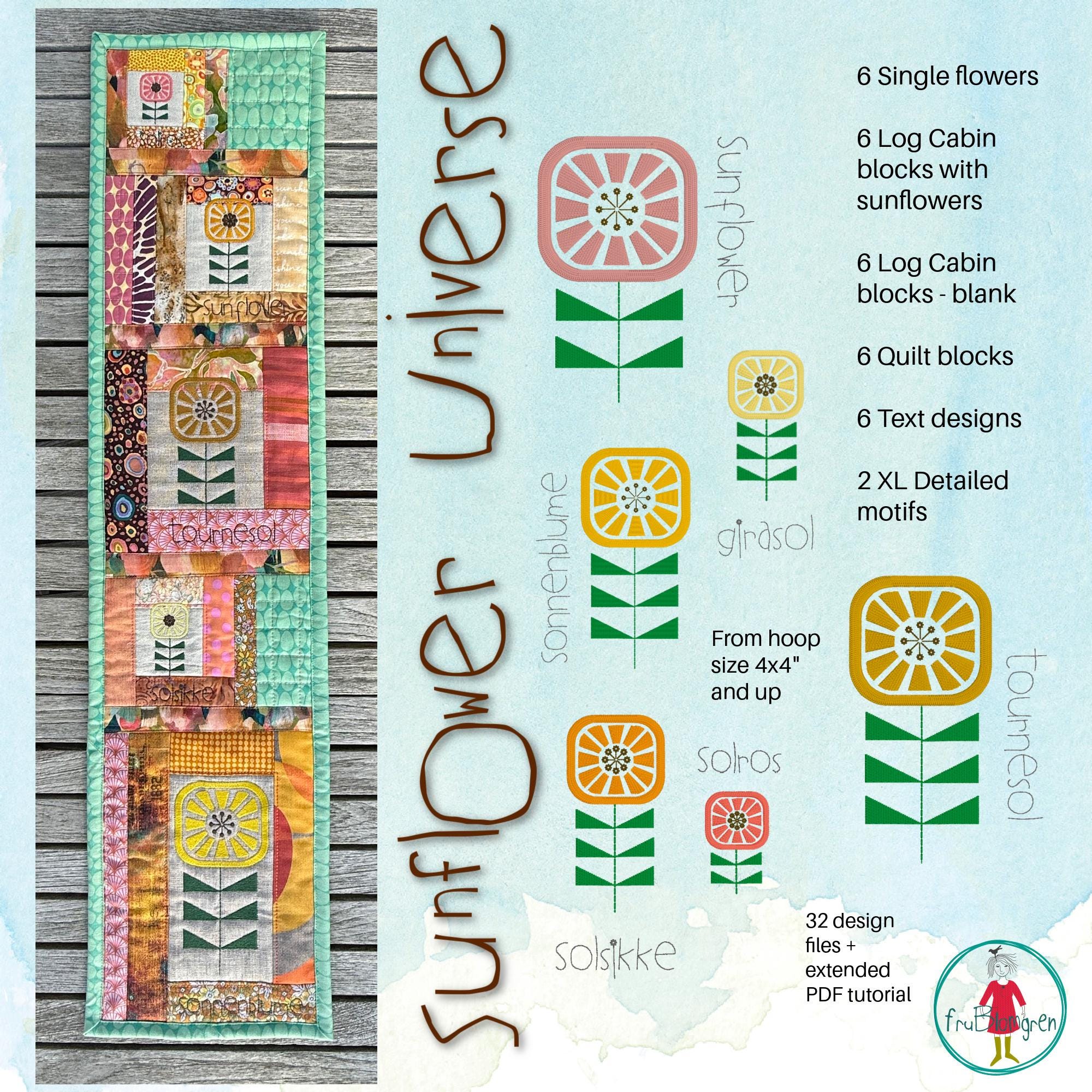 Sunflower Machine Embroidery Designs – Stylized Sunflowers, Sunflower texts in 6 languages, Quilting & Patchwork Blocks, Log Cabin & XXL Motifs