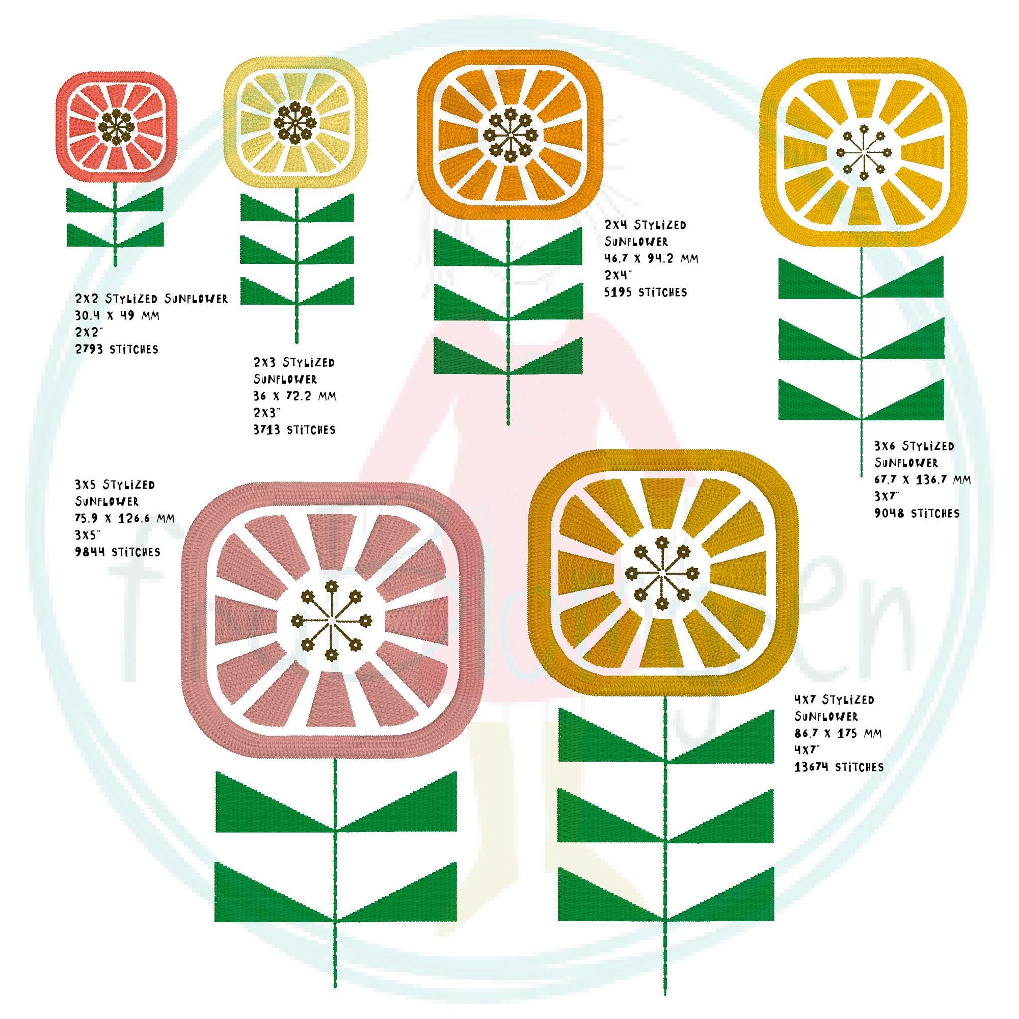 Stylized Sunflowers – 6 sizes, 3 colours, easy to mix and match.