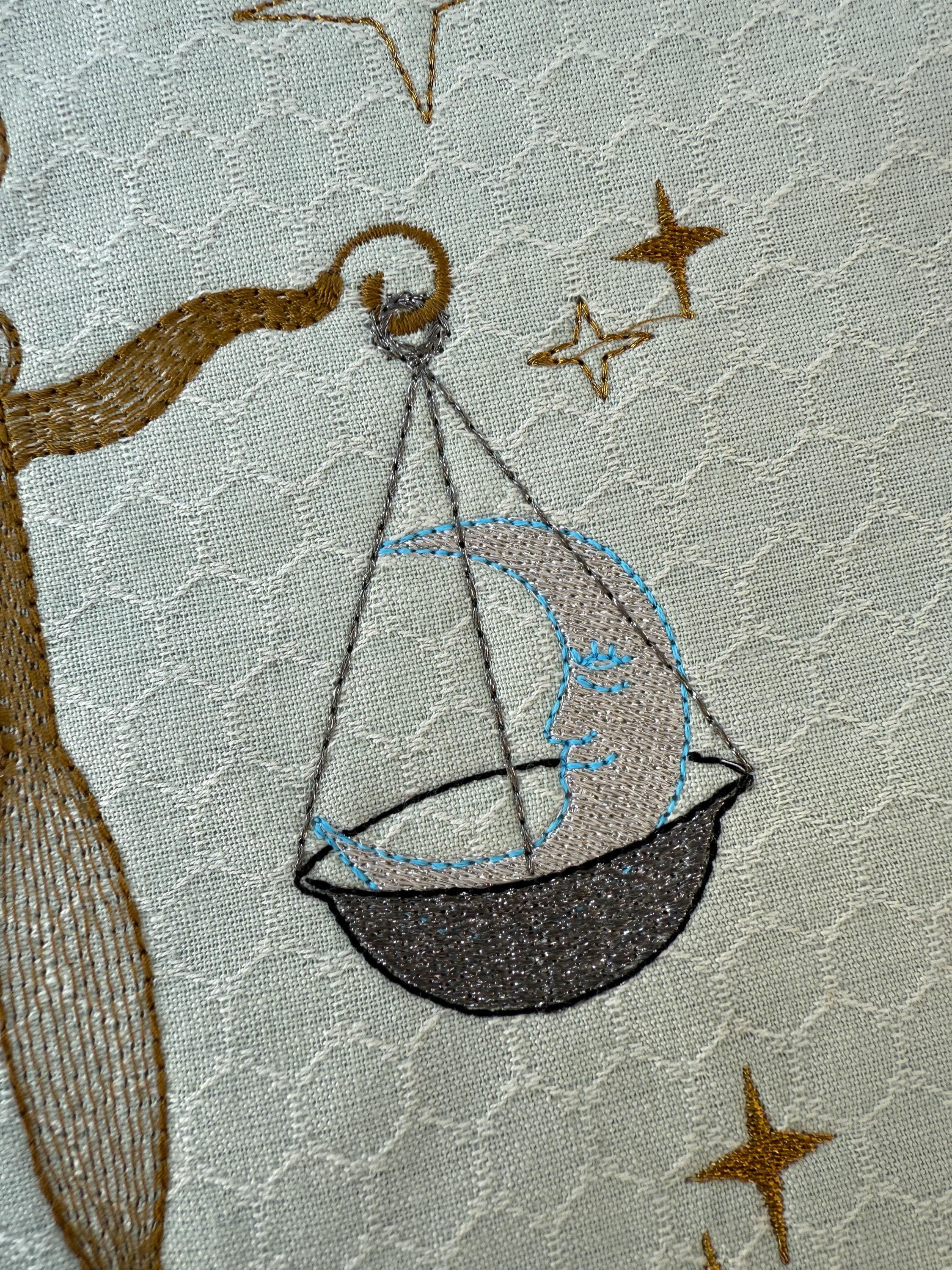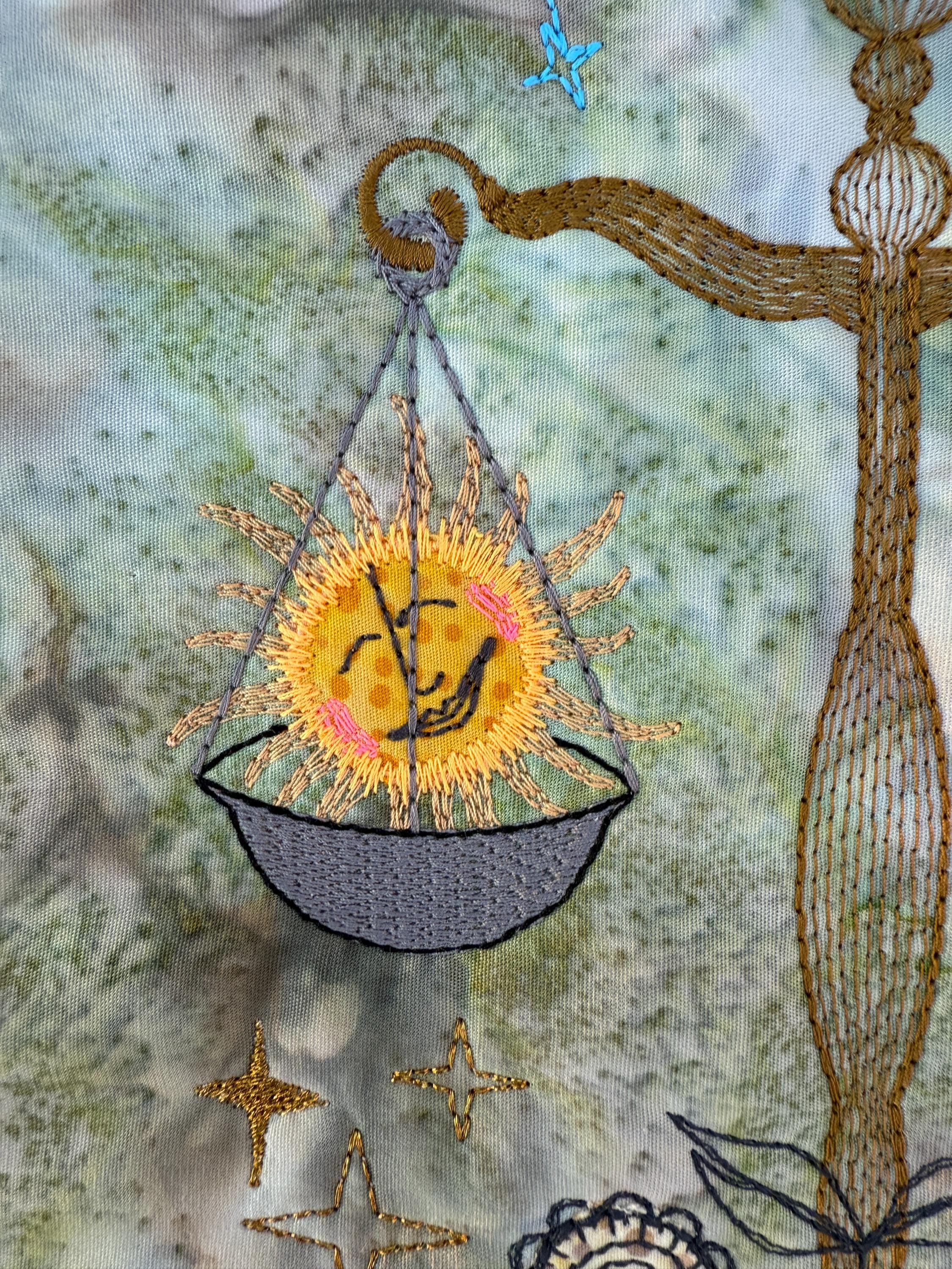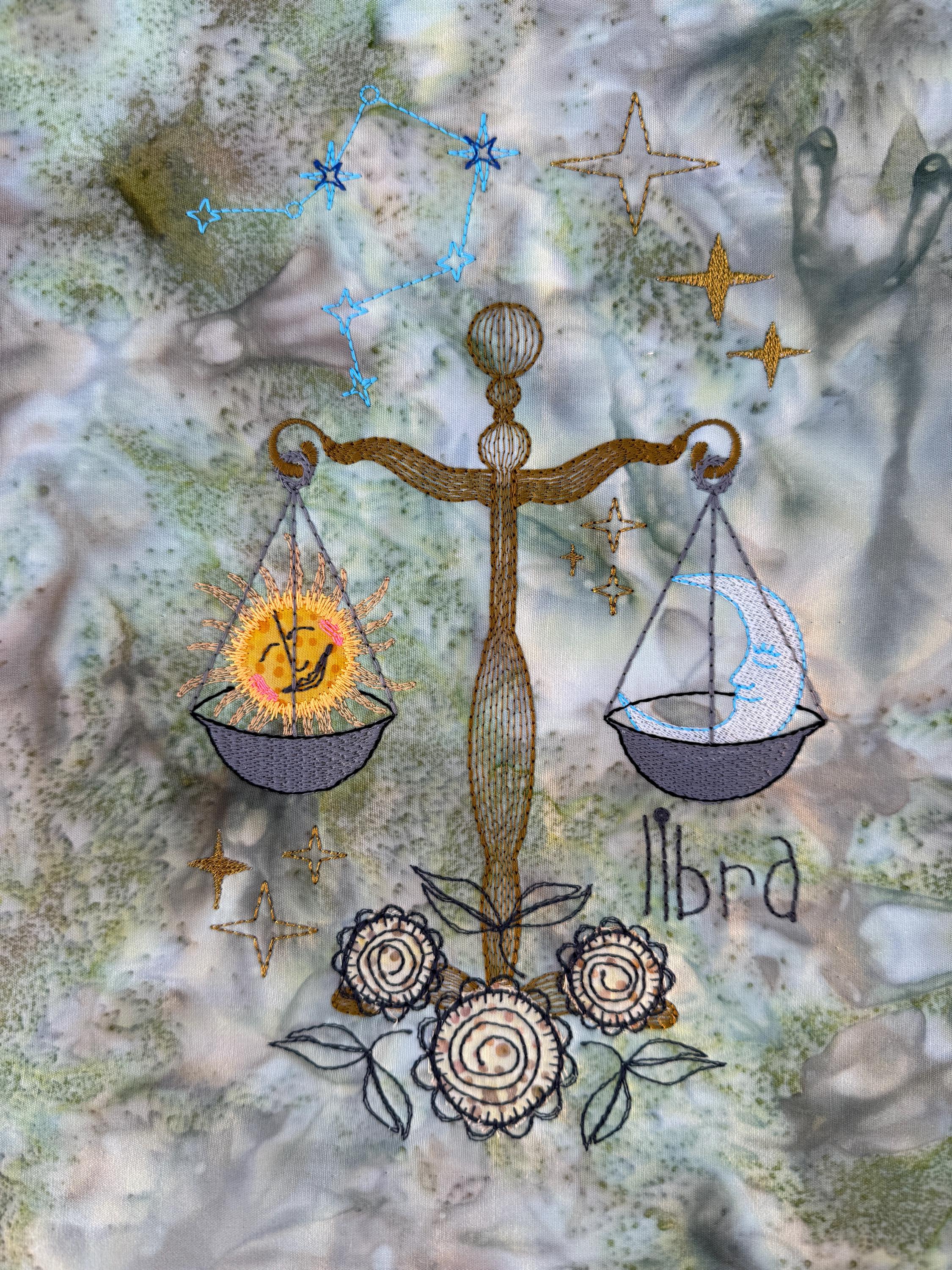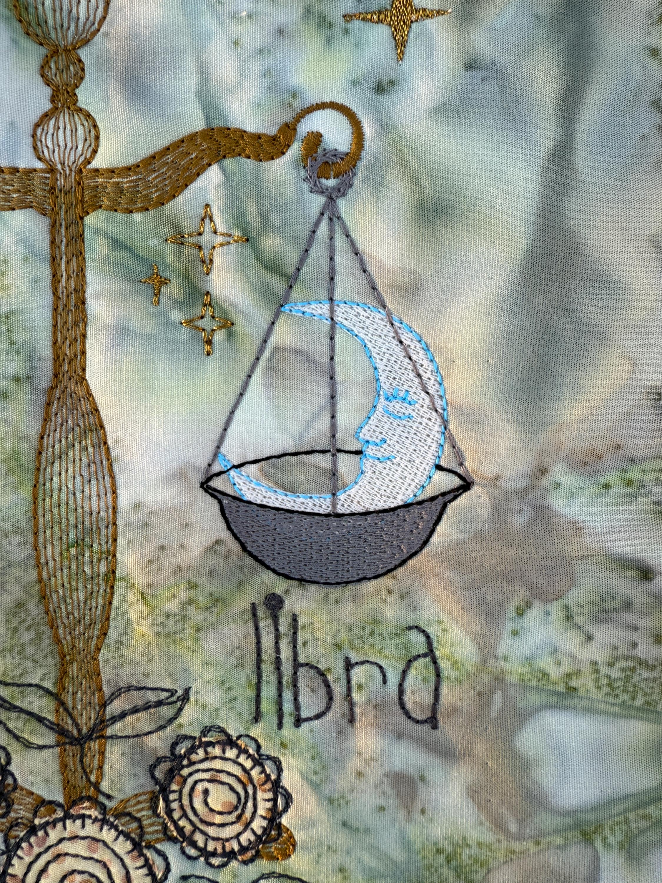 Exploring Libra with thread opens up endless possibilities. Metallics and shiny threads make the stars gleam, while soft matte tones create depth and calm. Different appliqué fabrics for the flowers allow you to adapt the mood – from playful to elegant, from subtle to vibrant. In every stitch, Libra reminds us of the beautiful balance between day and night, sun and moon.