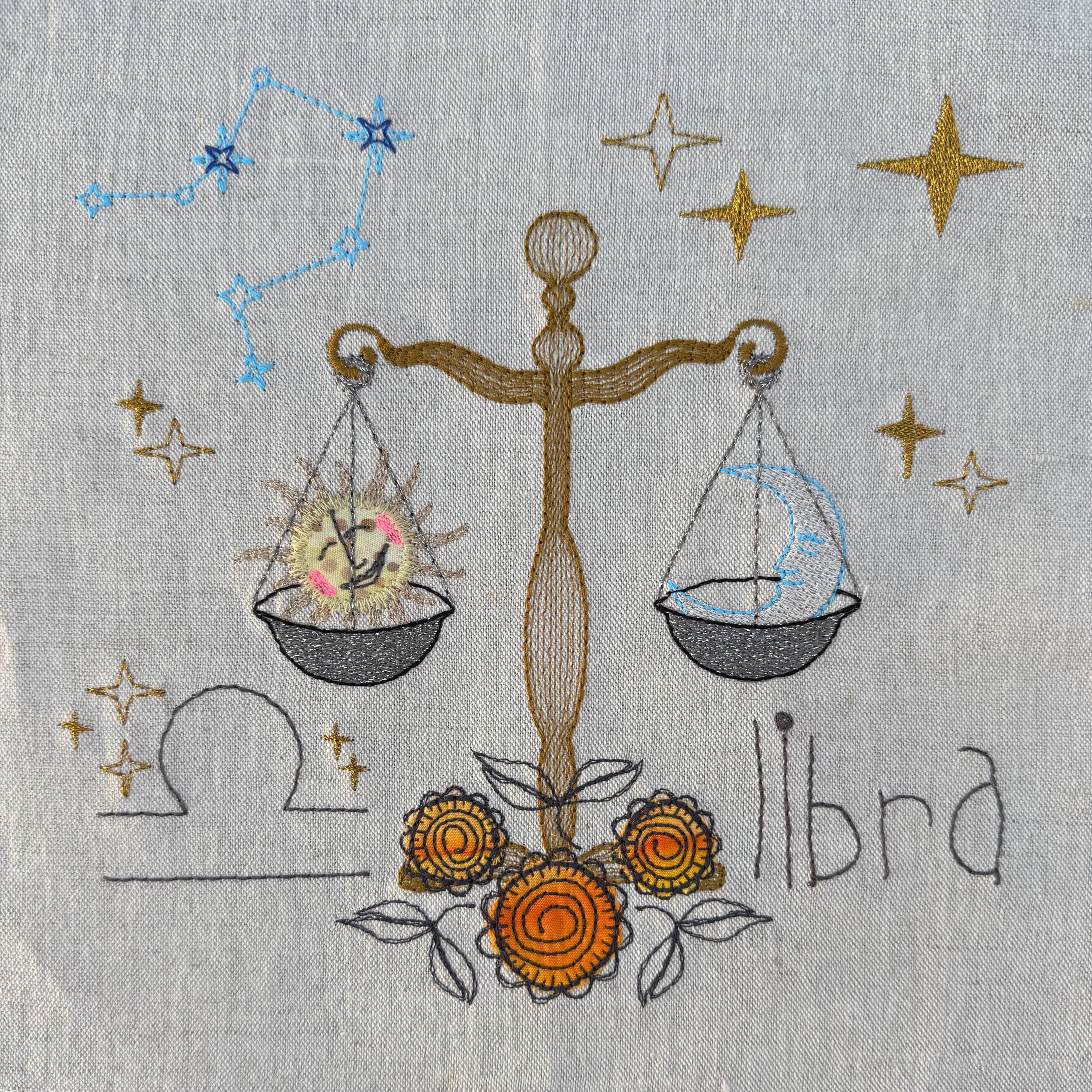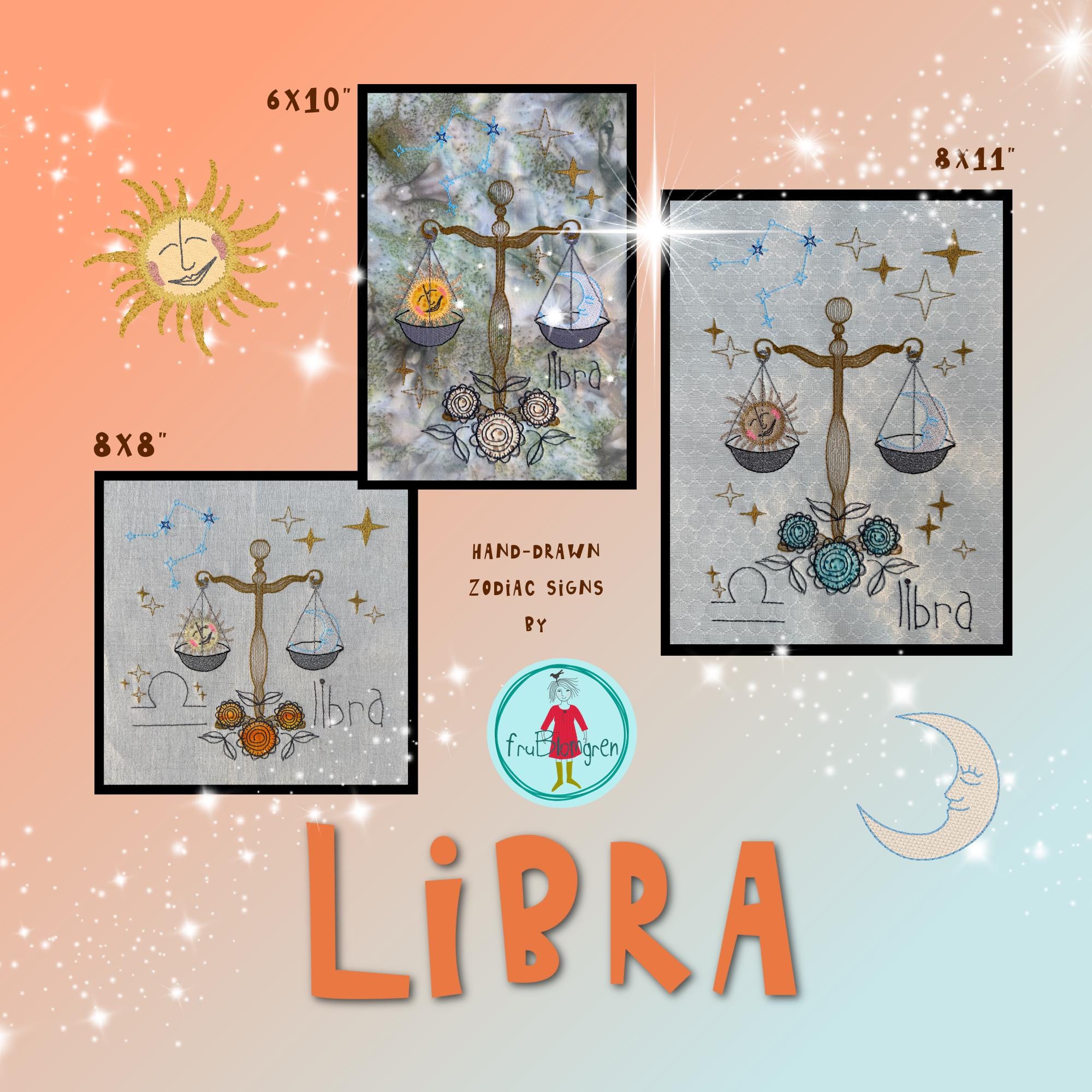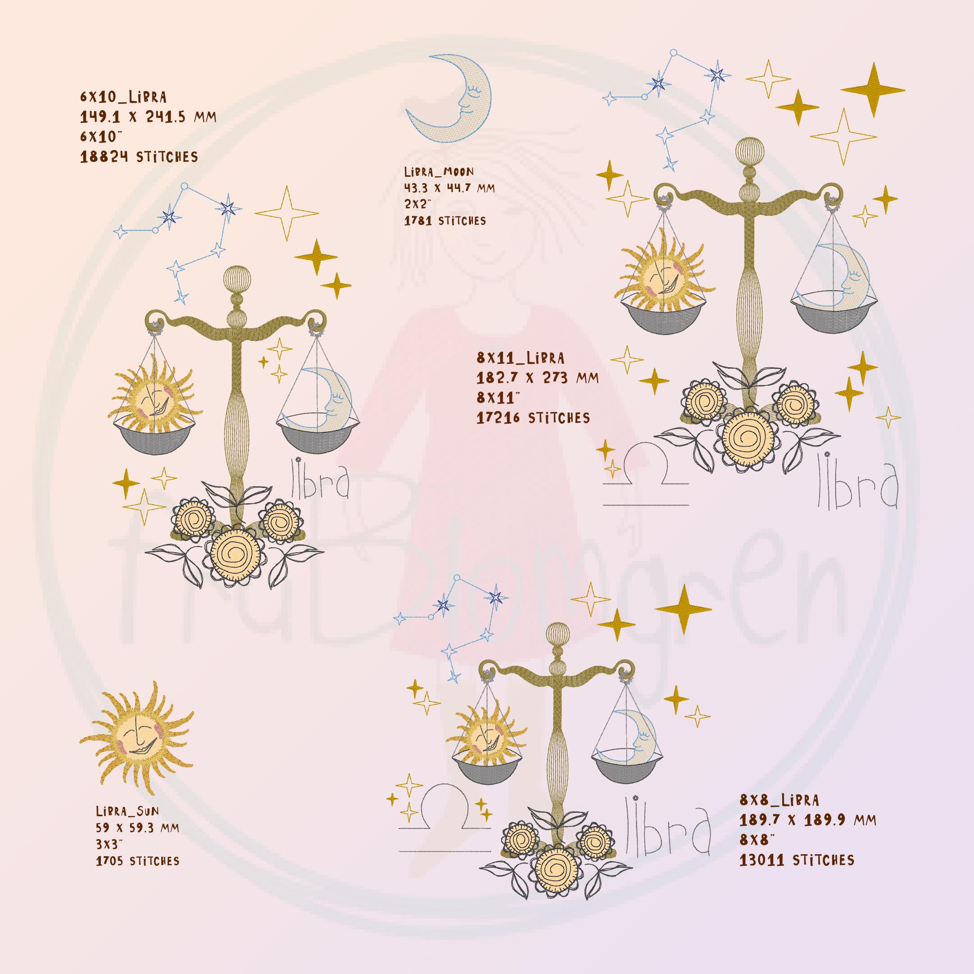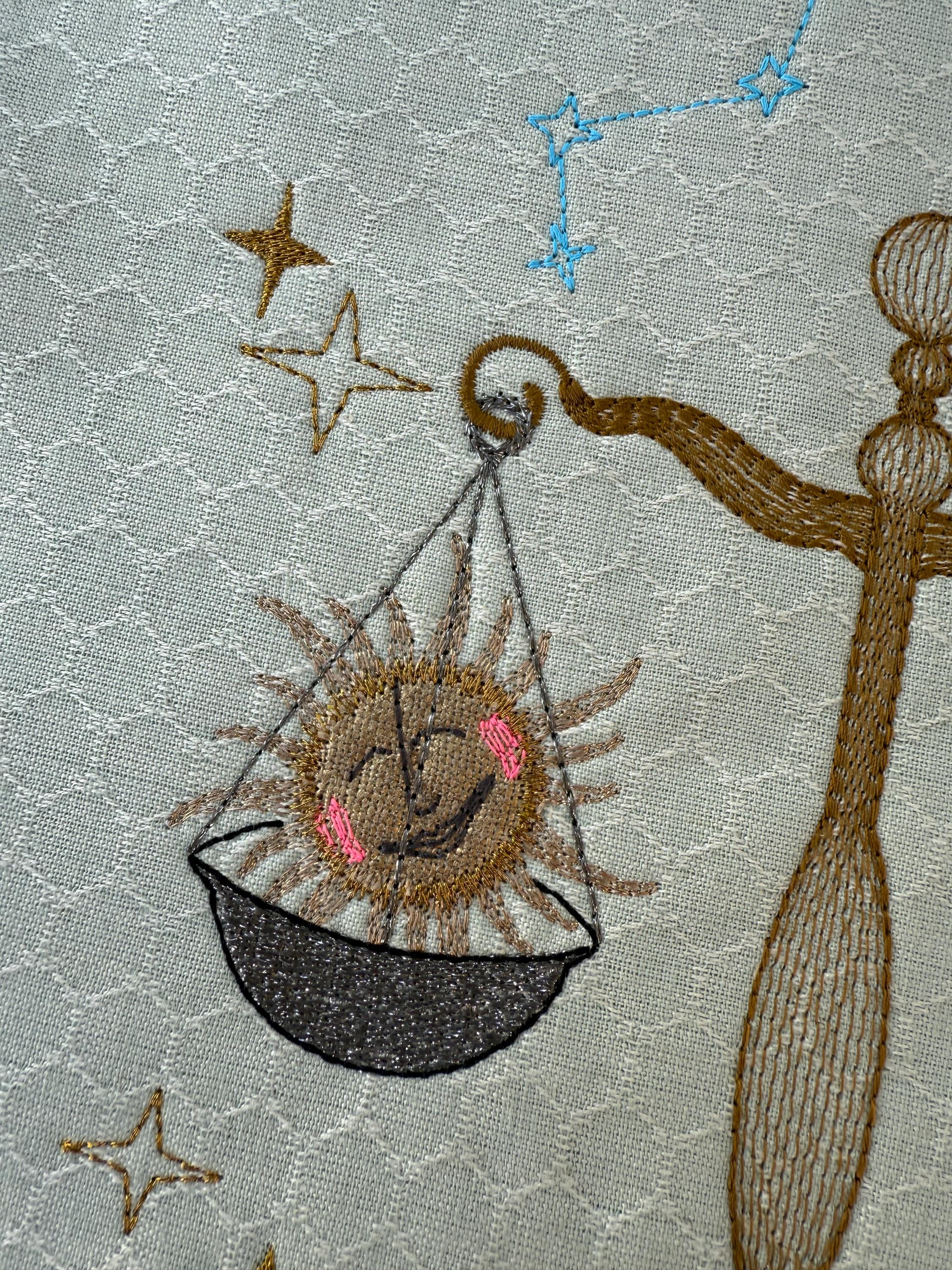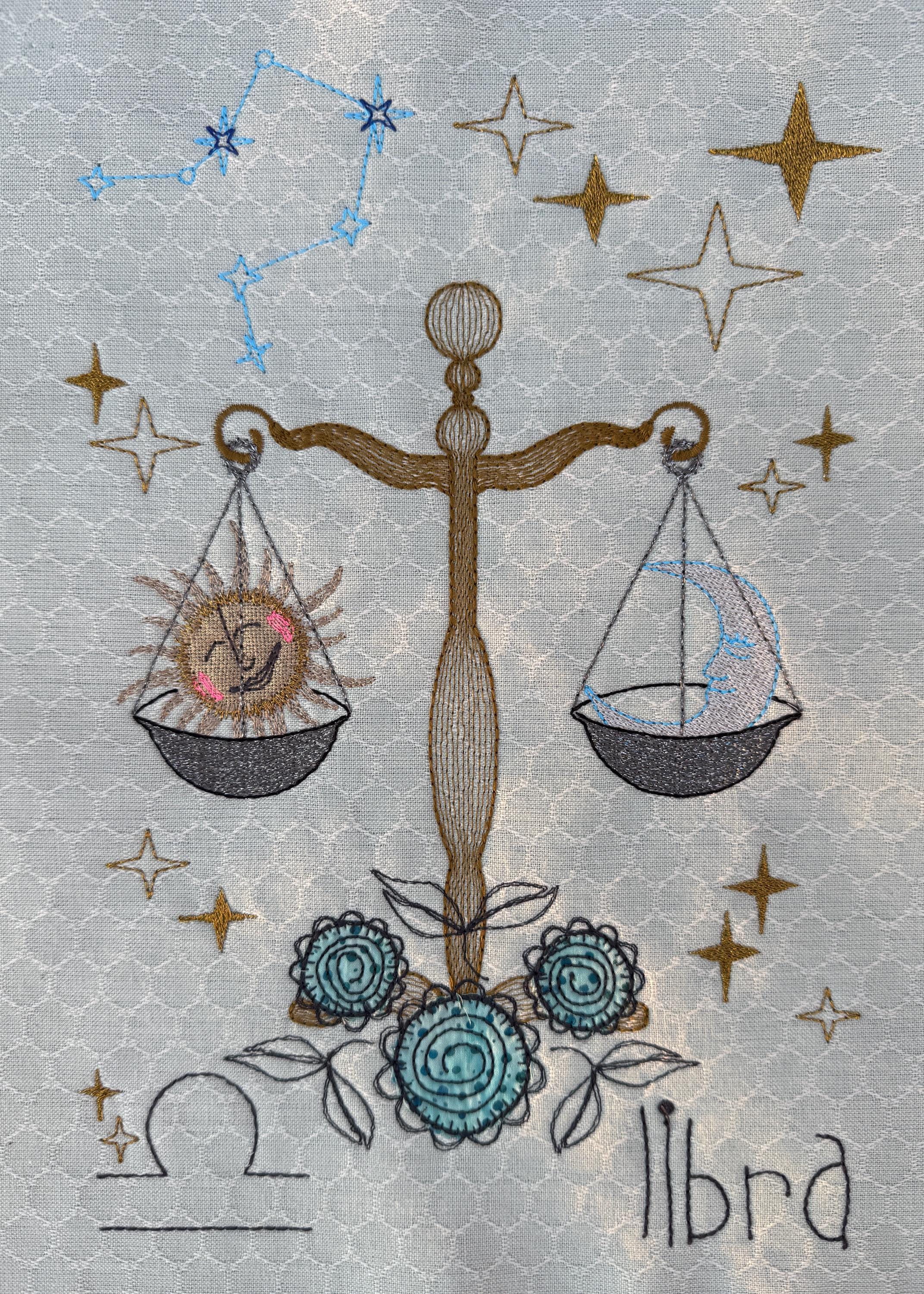 In the larger versions, the scales with sun and moon are framed by a fuller universe: sparkling stars, the Libra constellation, and the zodiac sign itself. The appliqué flowers anchor the design, adding softness and detail to the cosmic scene. With this extra richness, the larger Libras become striking centerpieces – whether stitched as wall art, on garments, or as bold statement projects.