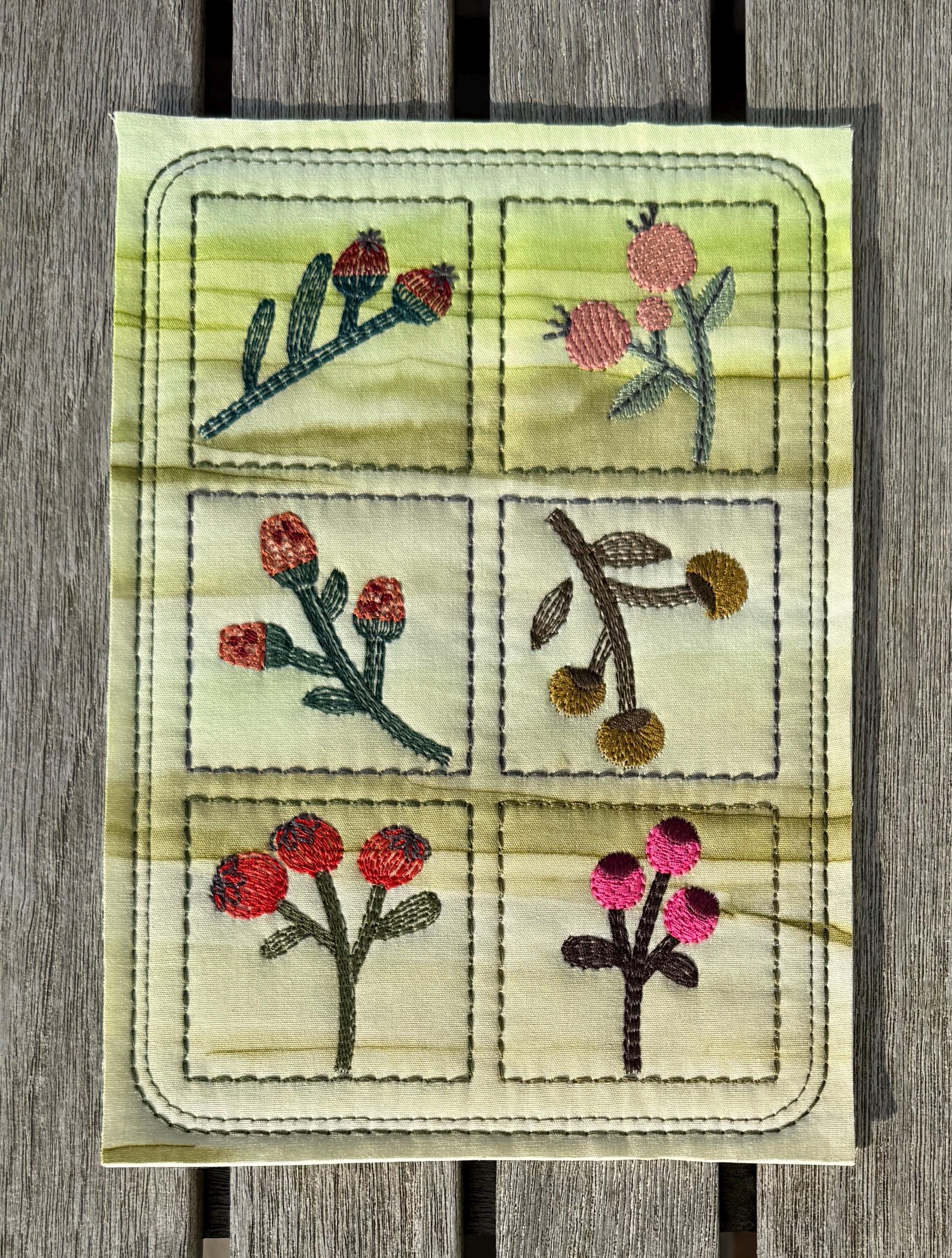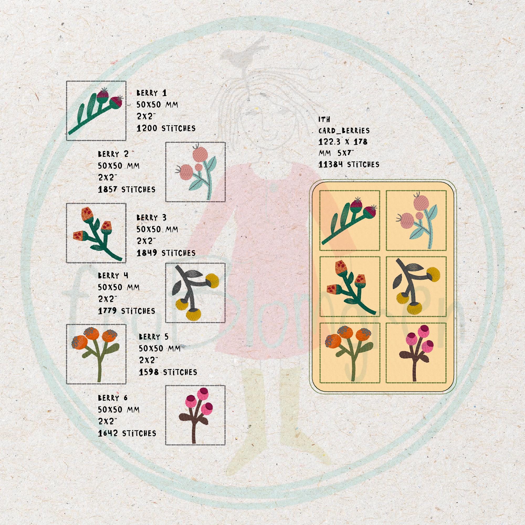 Youâre welcome to stitch them as they are, omit the texts, exchange them with your own words, or even add little birds to the berry creations. The single berry branches are designed inside the same sashiko-style square frame as my 2x2" squares, so they can be mixed and matched with those too. And as an extra inspiration, Iâve included a small but useful ITH card featuring all six berry branches.