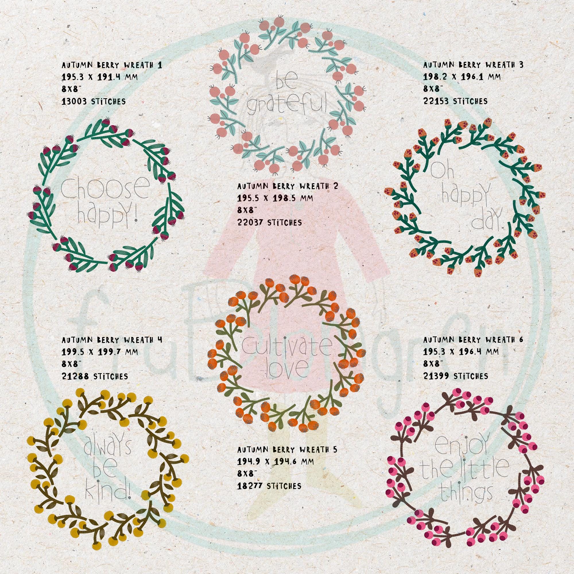 đż 6 stylized Autumn Berry Wreaths (8x8") â each with a different berry branch type and positive text: Choose happy, Be grateful, Oh happy day, Always be kind, Cultivate love, Enjoy the little things.