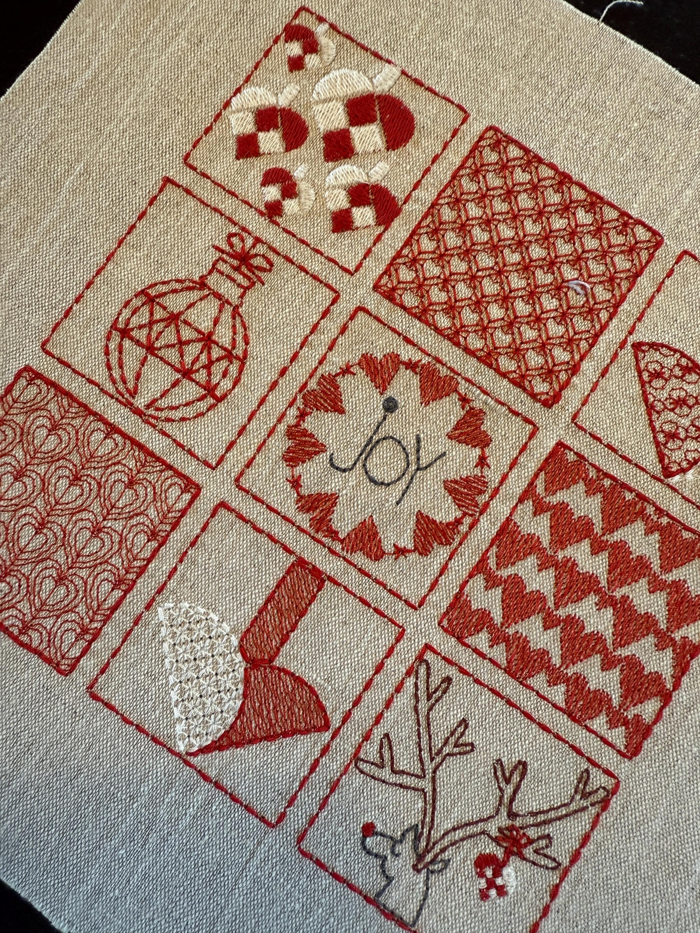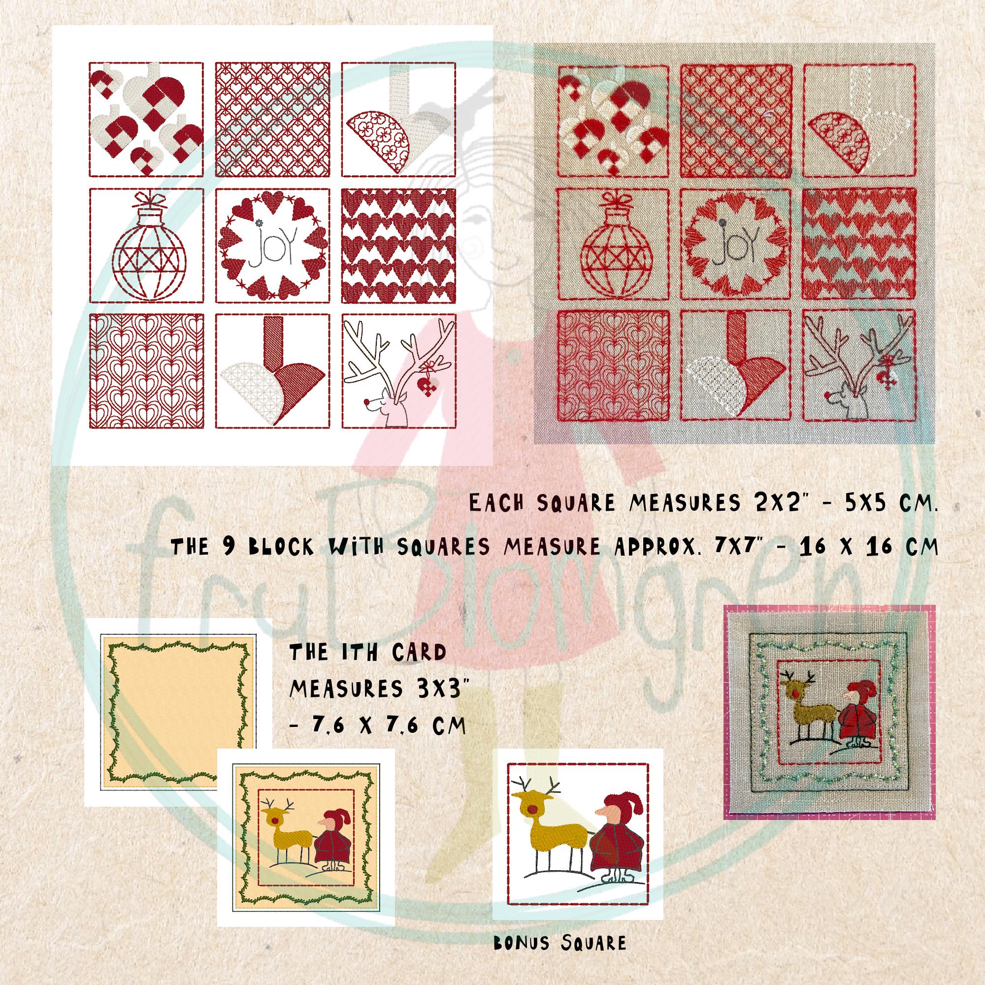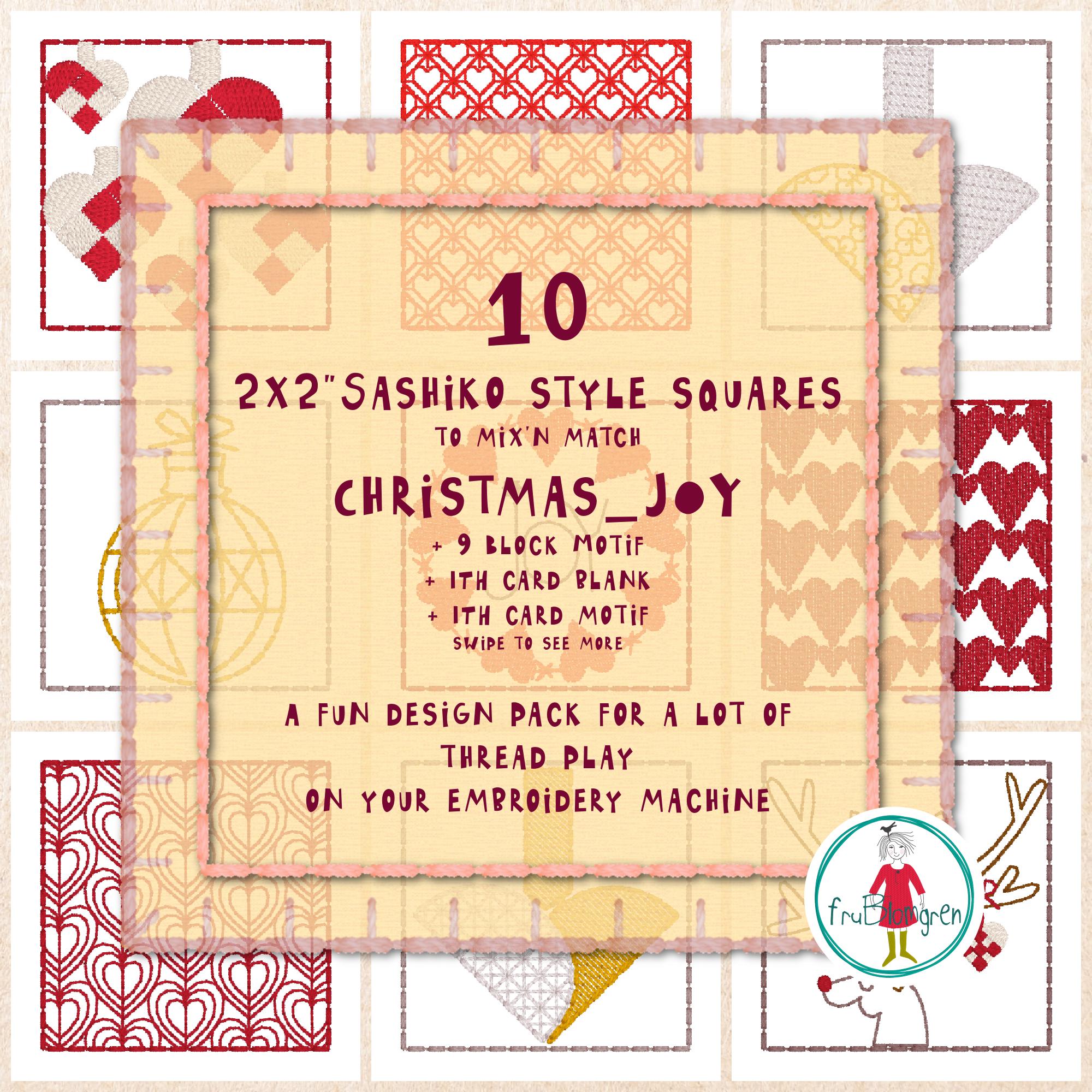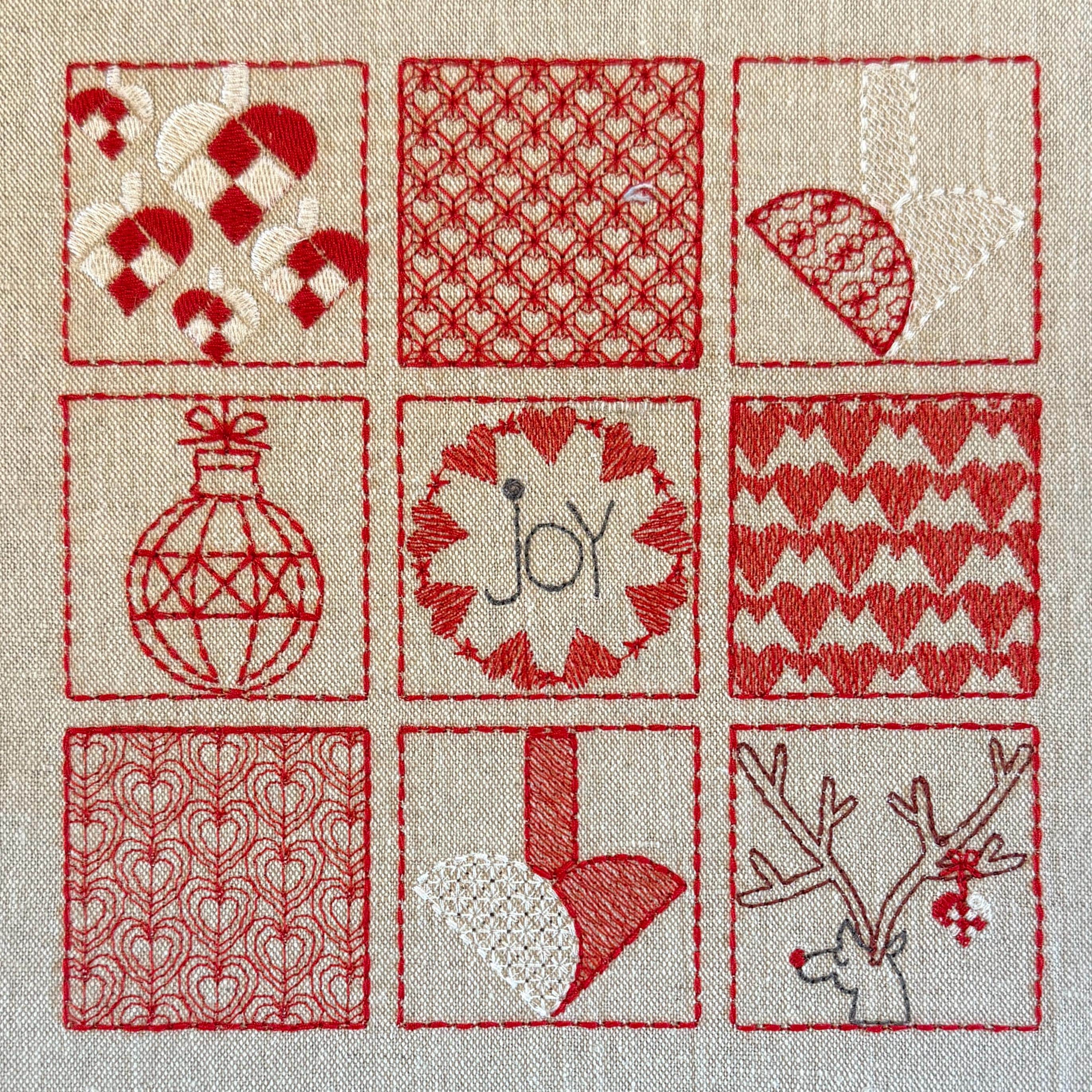 This Christmassy design pack - JOY - features 10 Sashiko-style embroidery squares (2x2”) in one or more colours — perfect for festive mix-and-match play across all your Christmas and winter projects.
