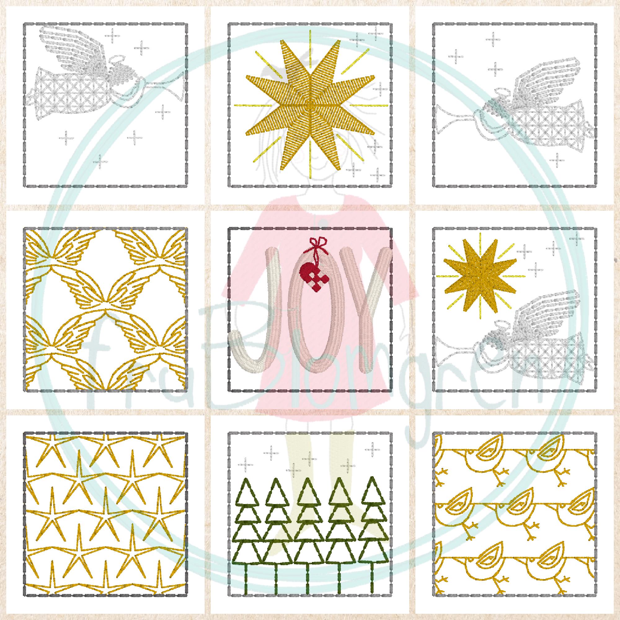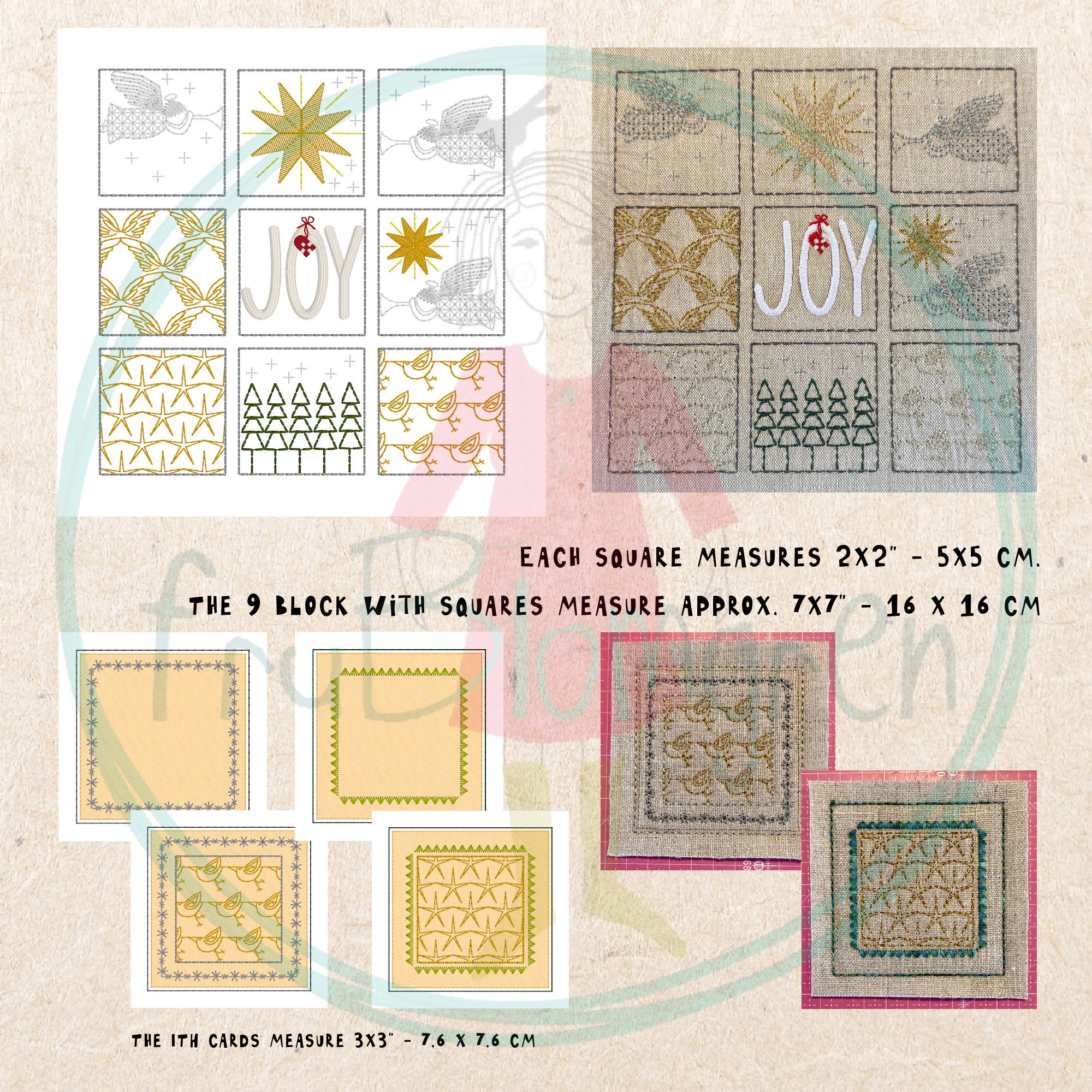 This Christmassy design pack - ANGELS - features 9 Sashiko-style embroidery squares (2x2”) in one or more colours — perfect for festive mix-and-match play across all your Christmas and winter projects.