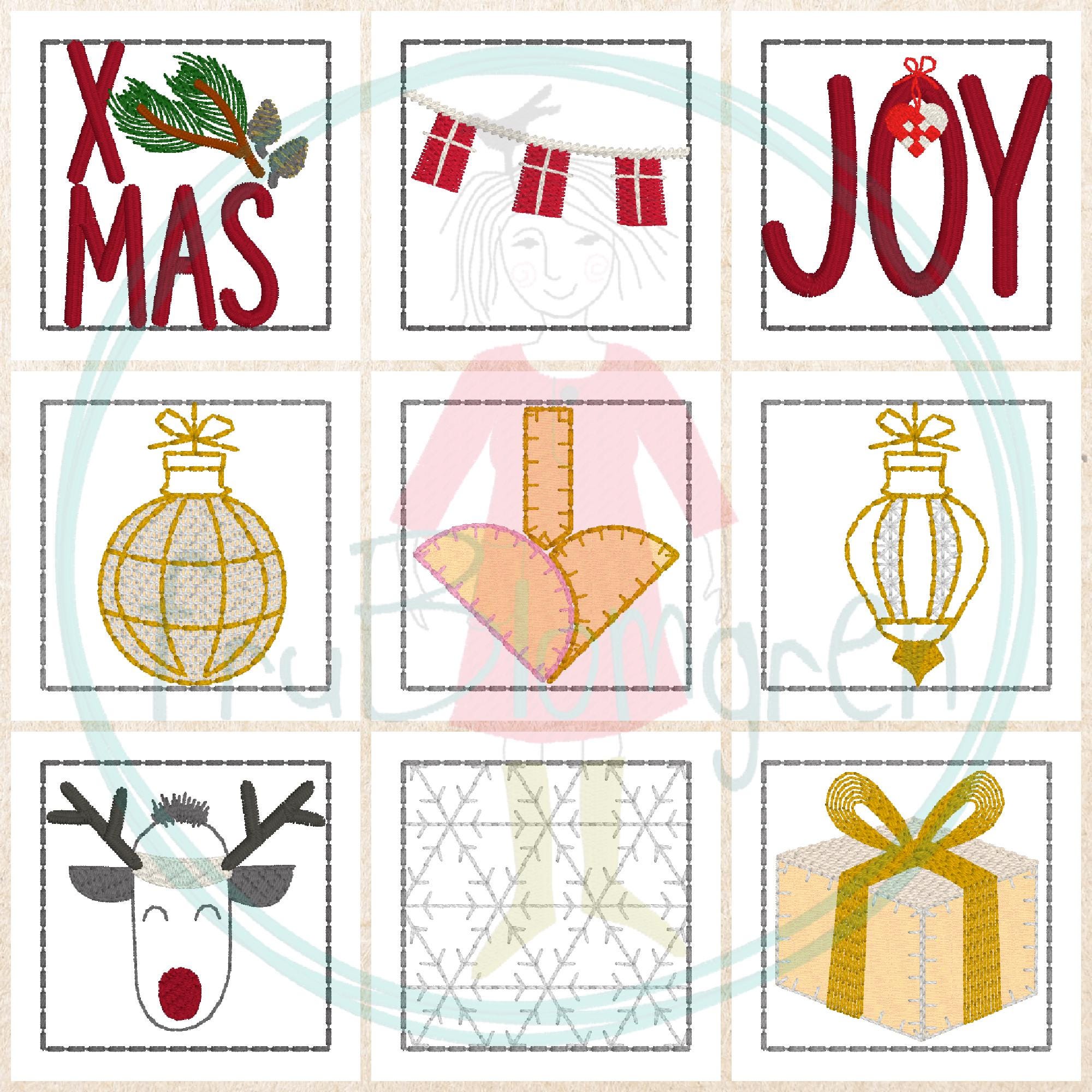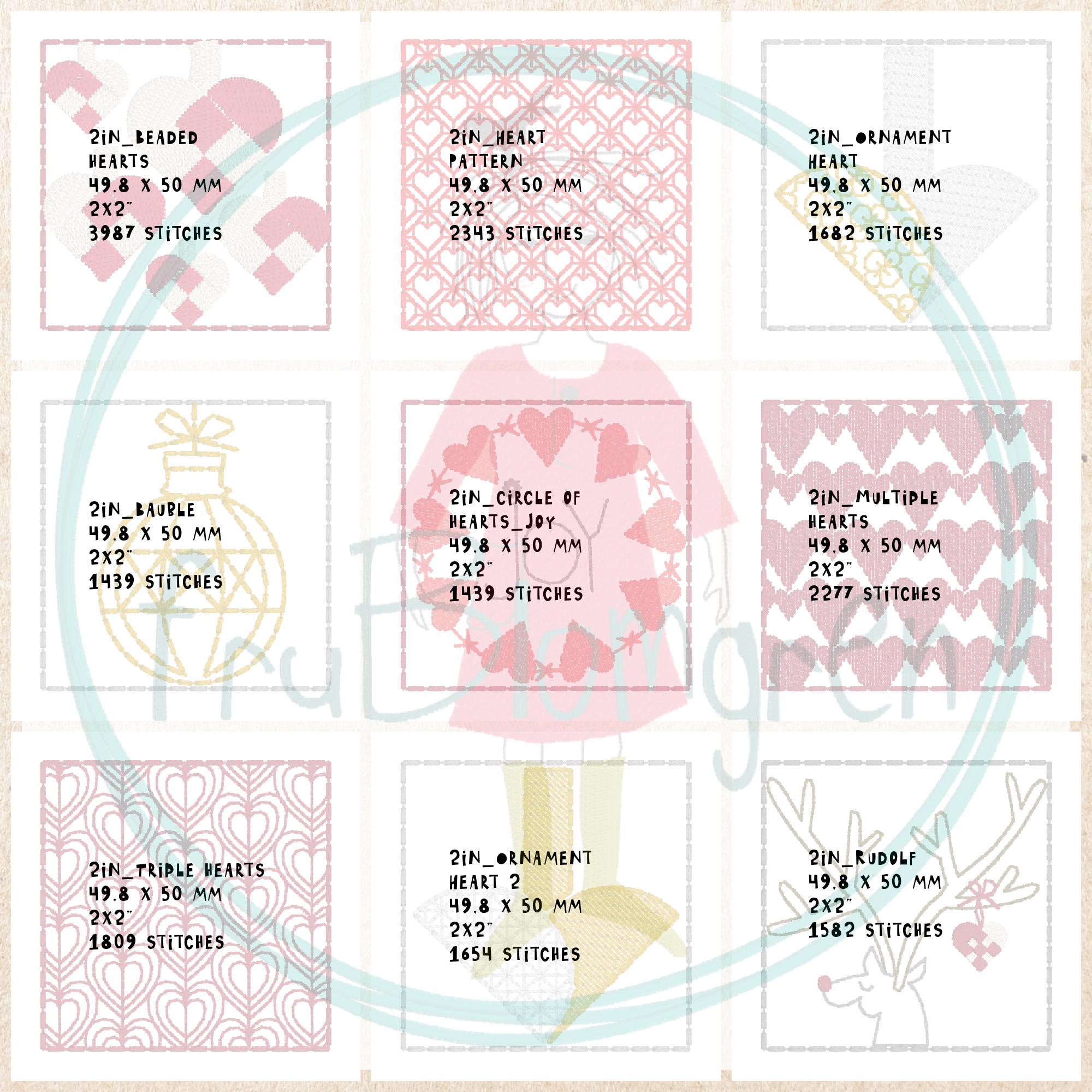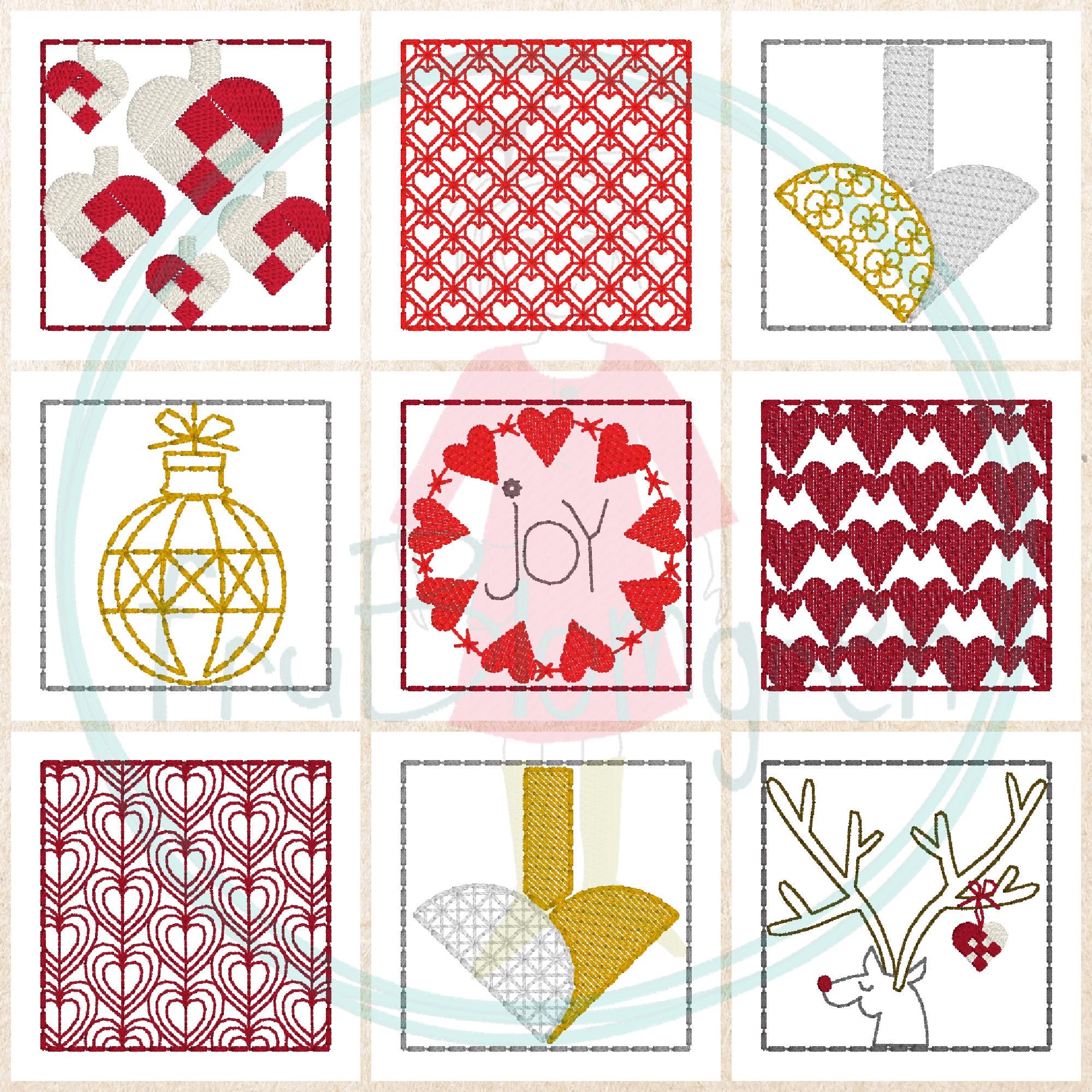 All squares measure 2x2” and are perfect for festive mix-and-match projects: patchwork blocks, mini quilts, stockings, table runners, mug rugs, gift tags, ITH cards and so much more.