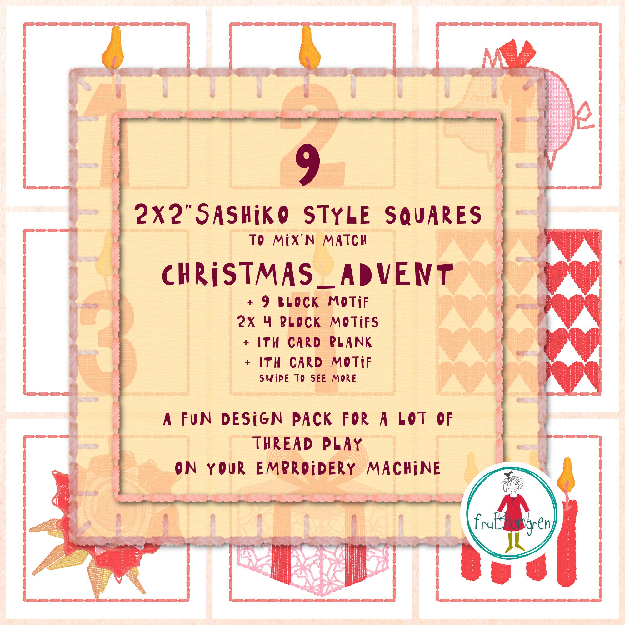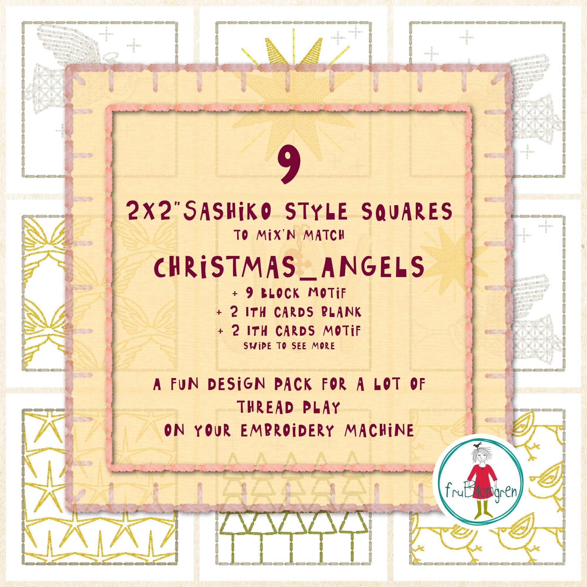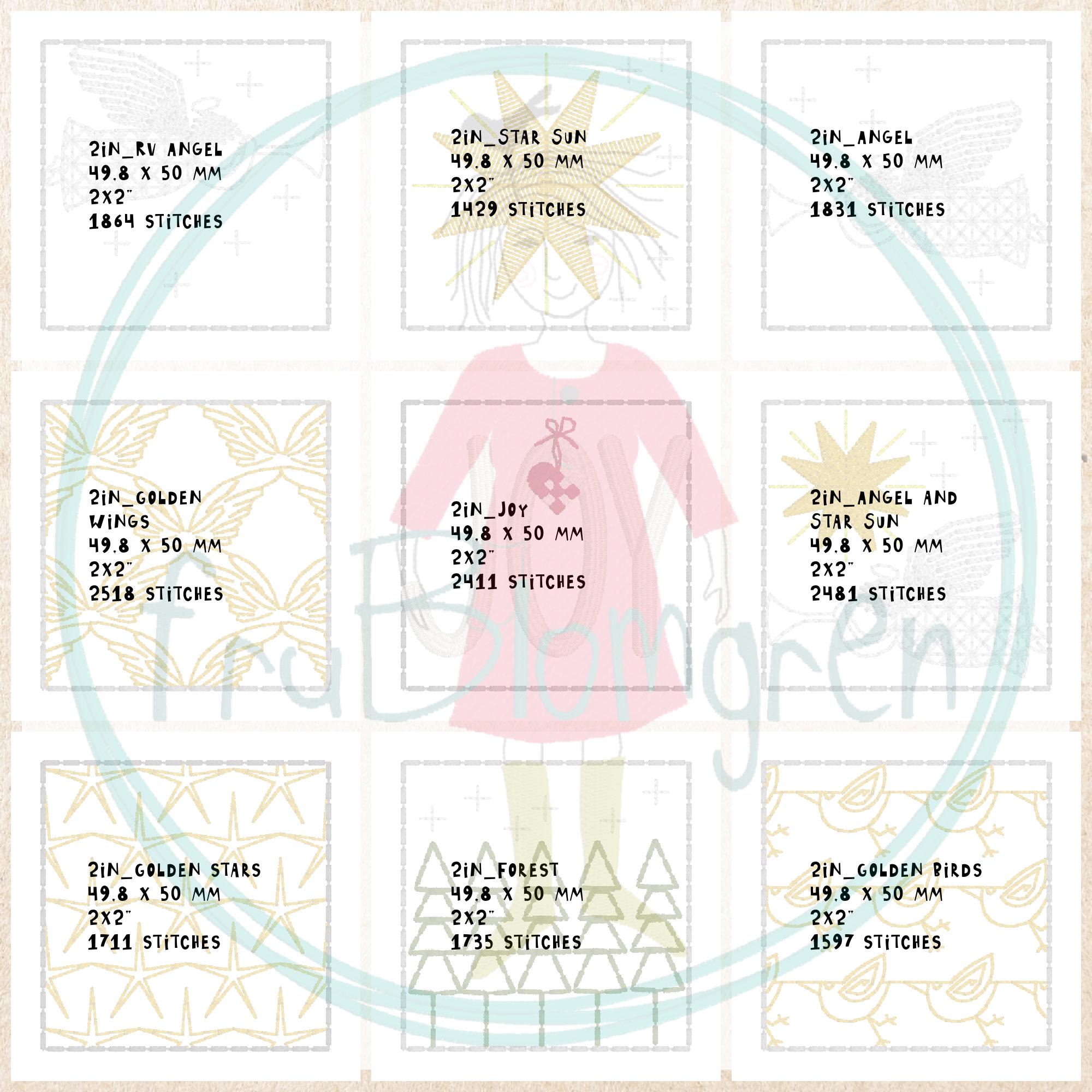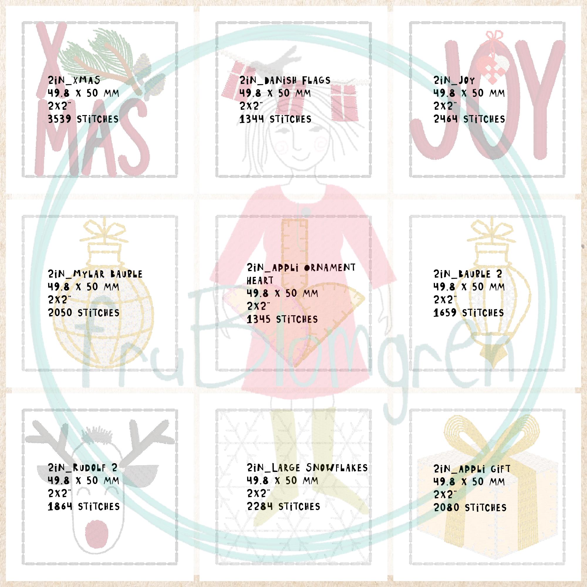 All squares measure 2x2” and are perfect for festive mix-and-match projects: patchwork blocks, mini quilts, stockings, table runners, mug rugs, gift tags, ITH cards and so much more.