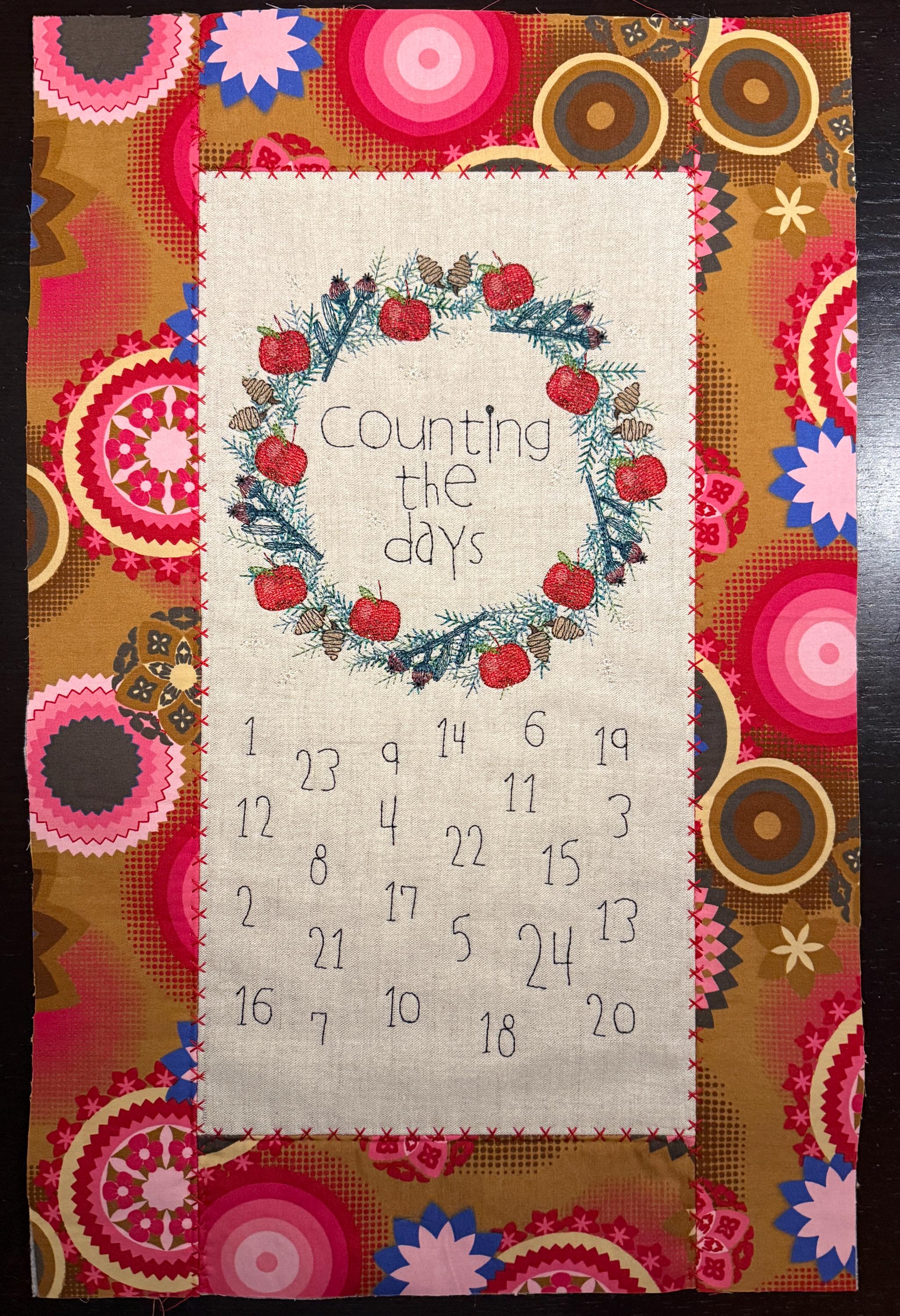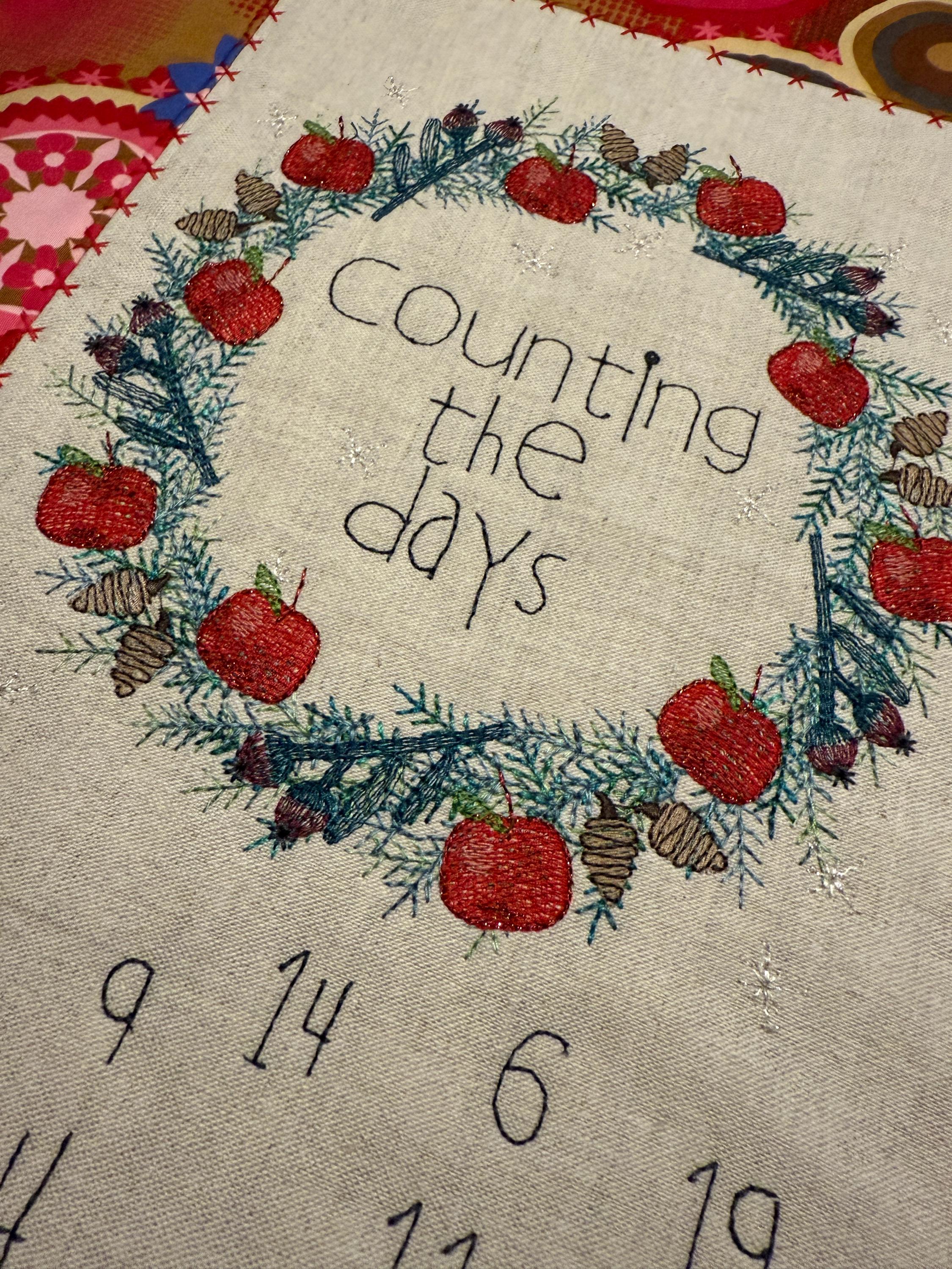 The wreath as an advent design is an XXL motif for the 8x14" hoop (20 × 36 cm) — and though it has around 32000 stitches, I have colour sorted the design and there are not that many thread changes and you should be able to prepare the strips to frame it whilst the machine stitches