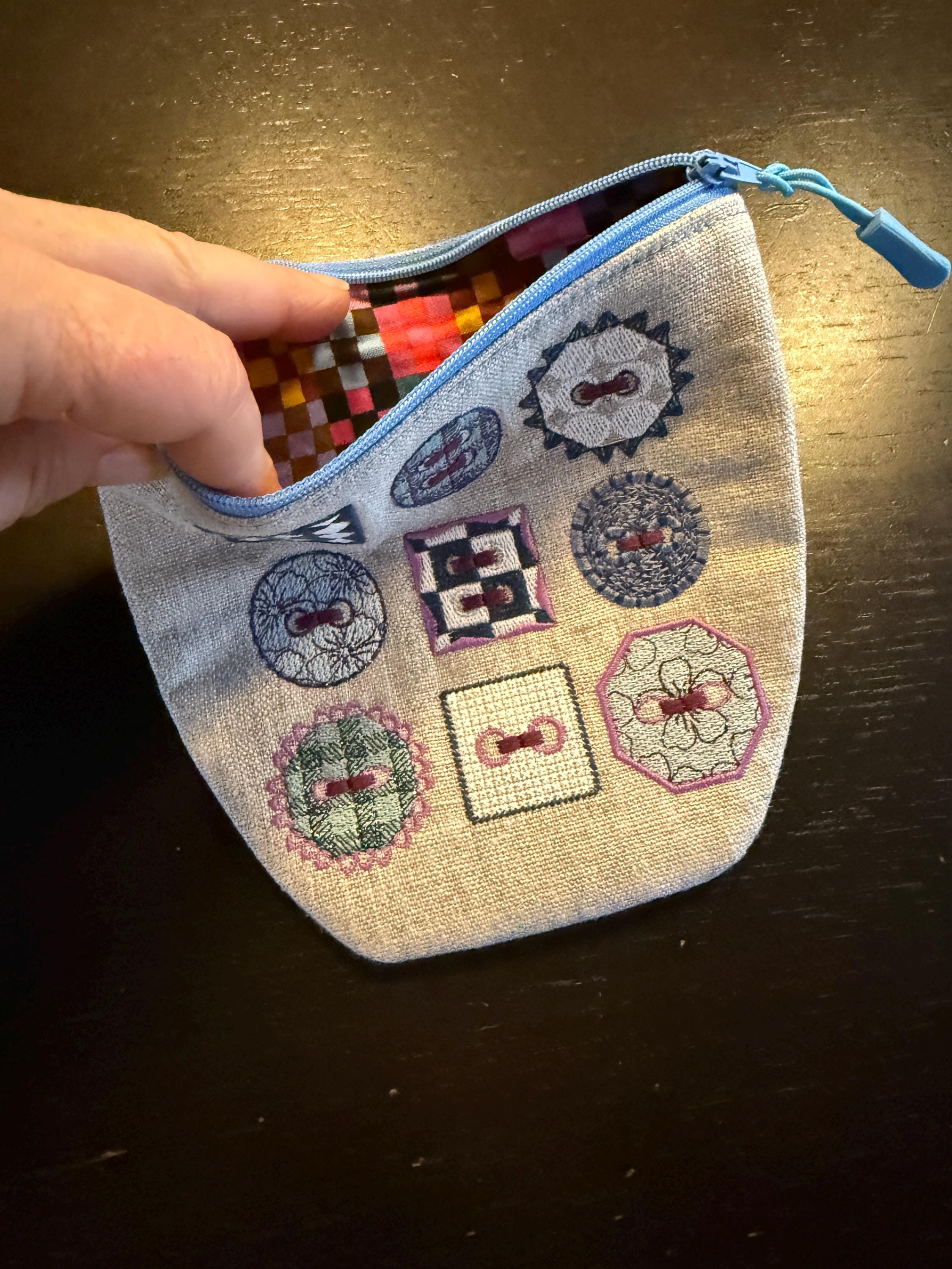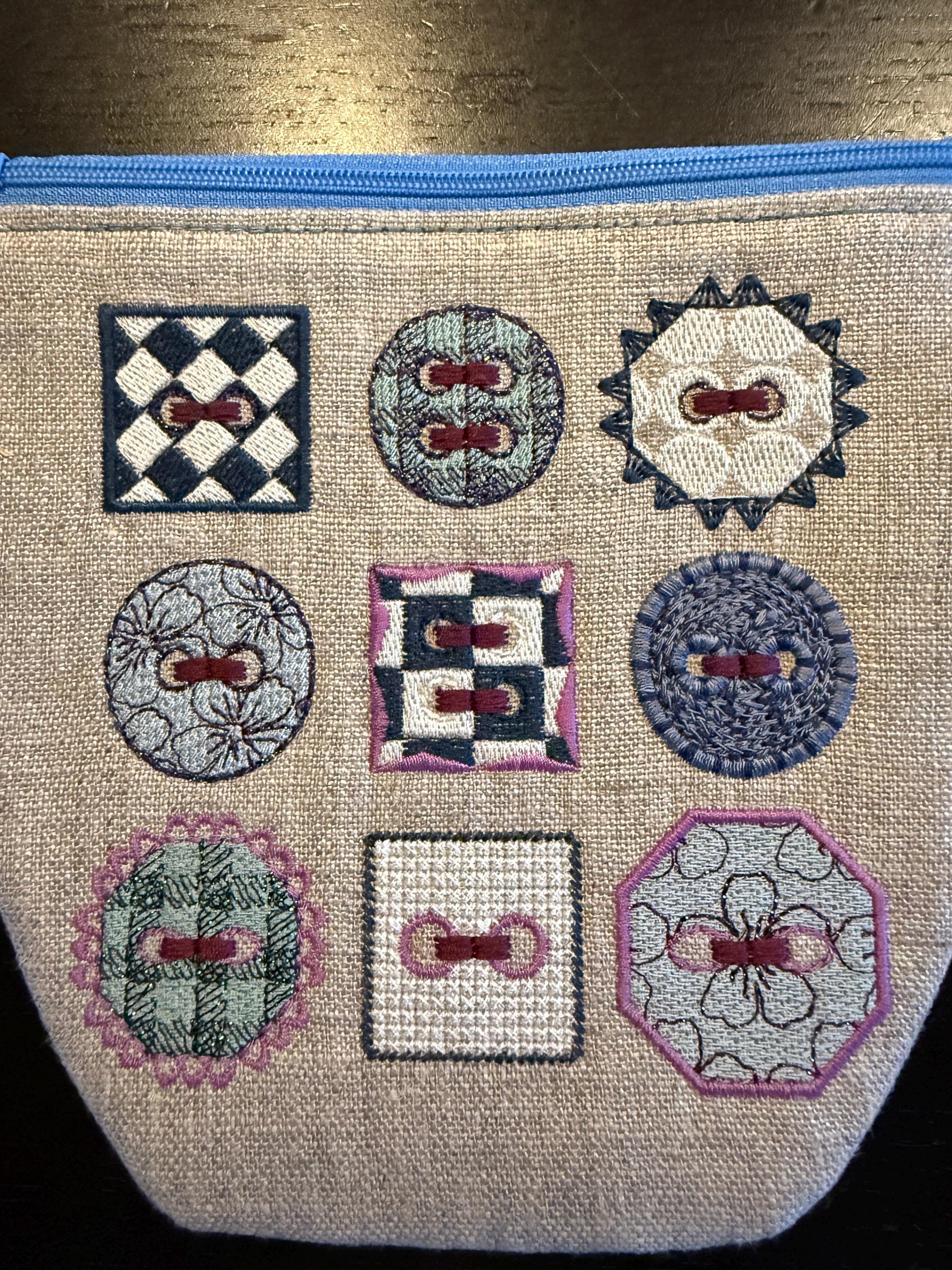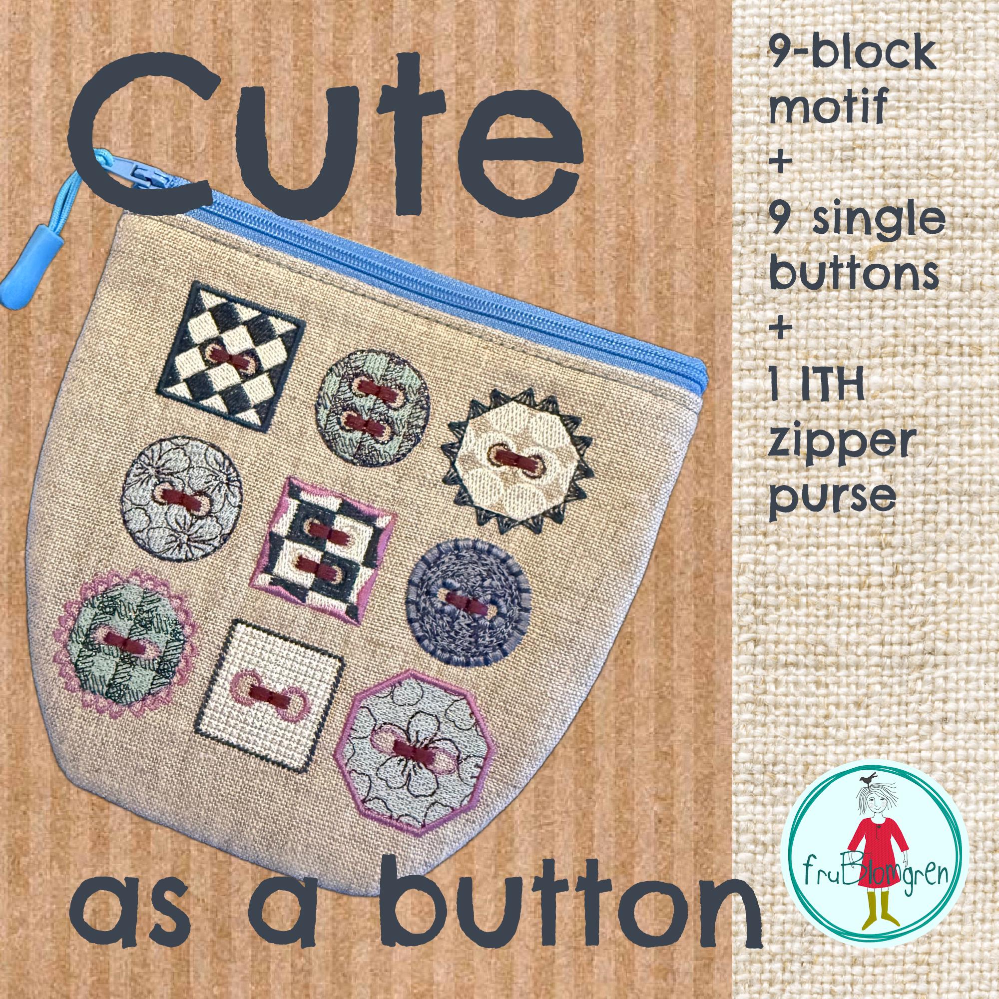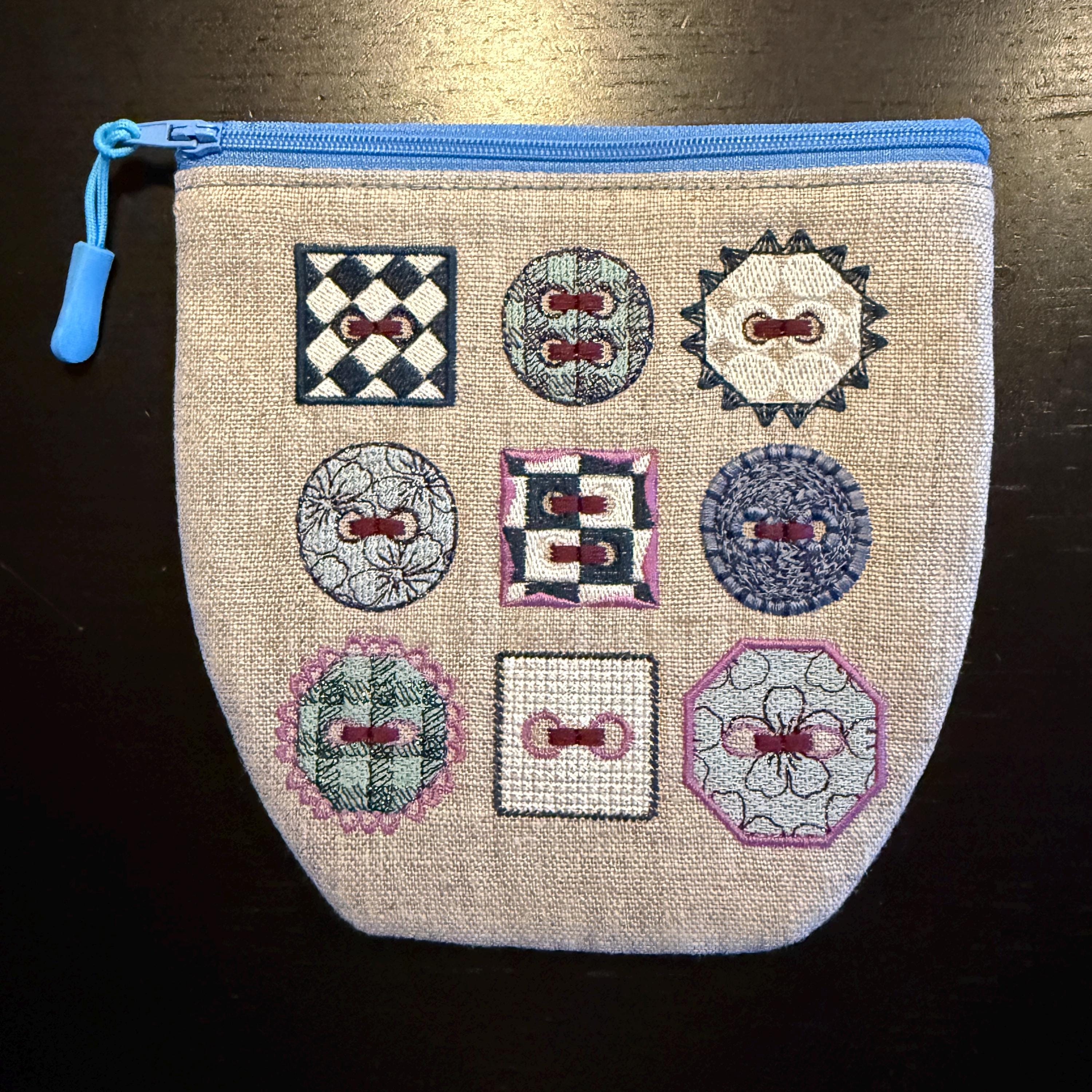 • 1 zipper pouch design (ITH) featuring the same 9 buttons as decoration