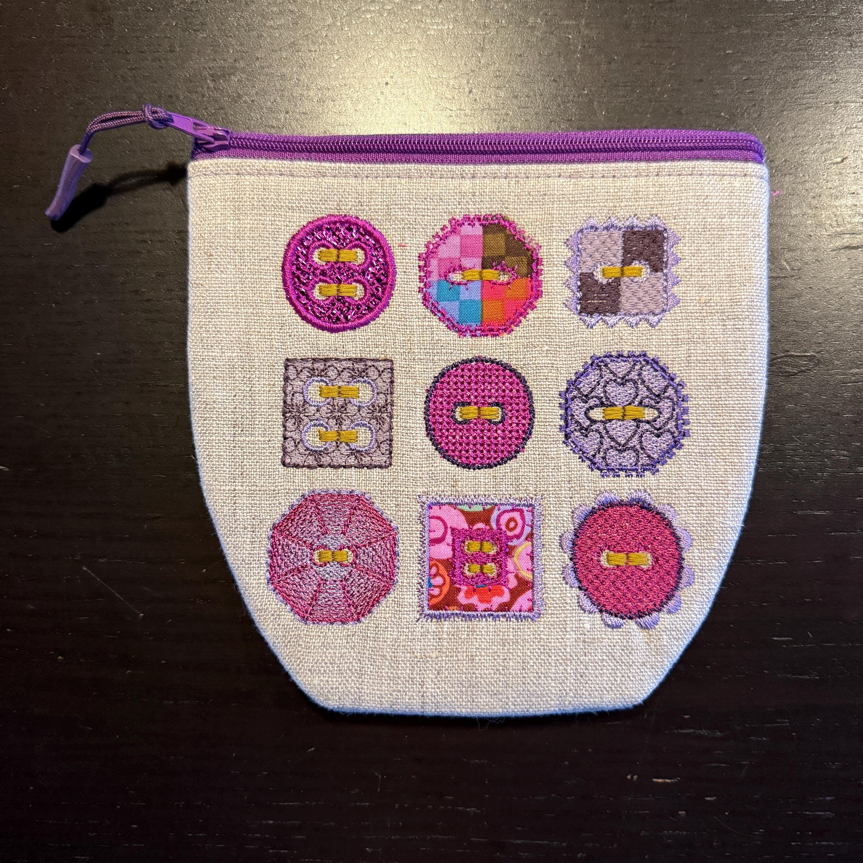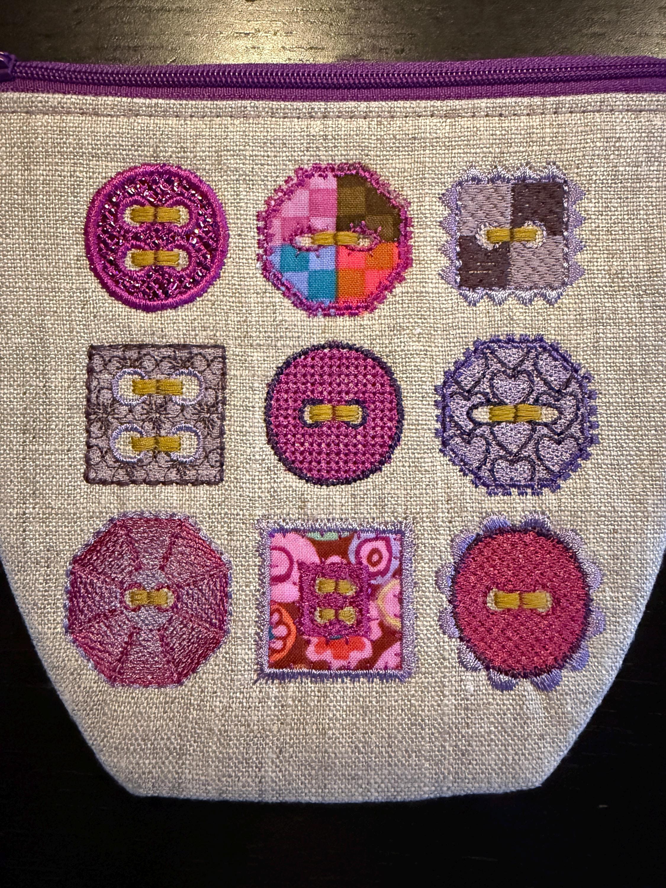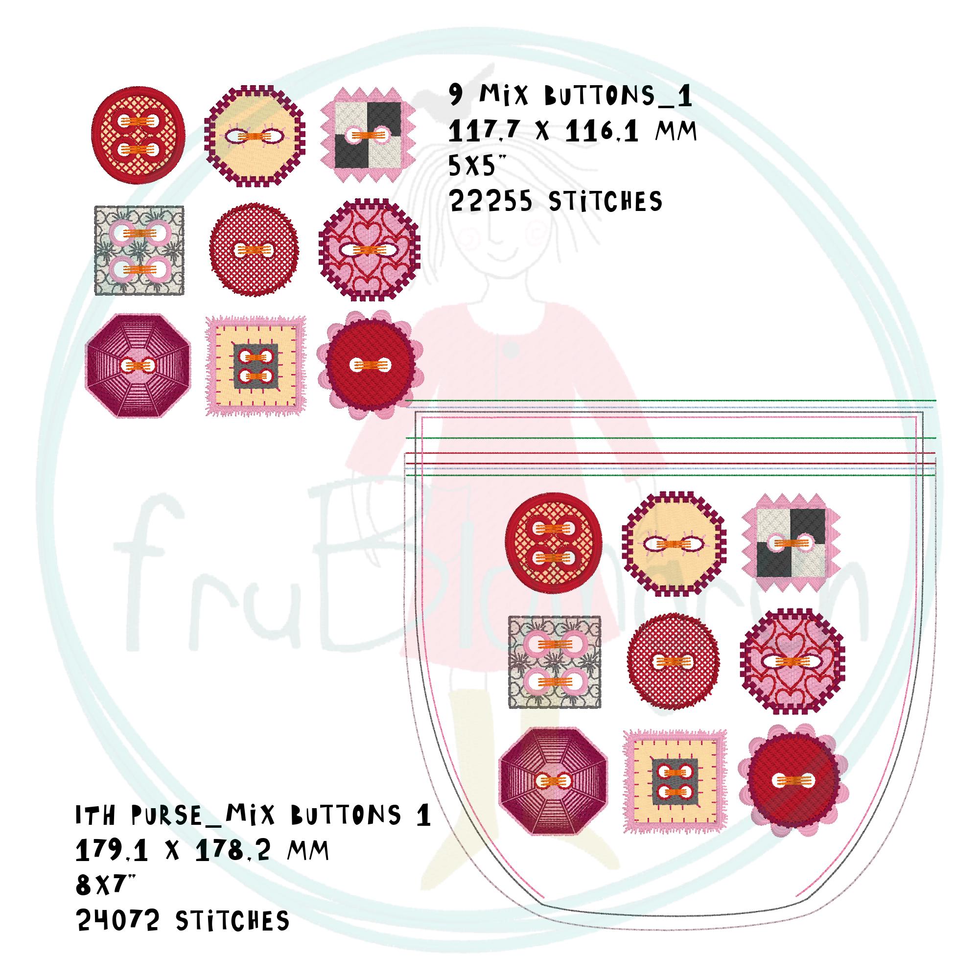 • 1 zipper pouch design (ITH) featuring the same 9 buttons as decoration