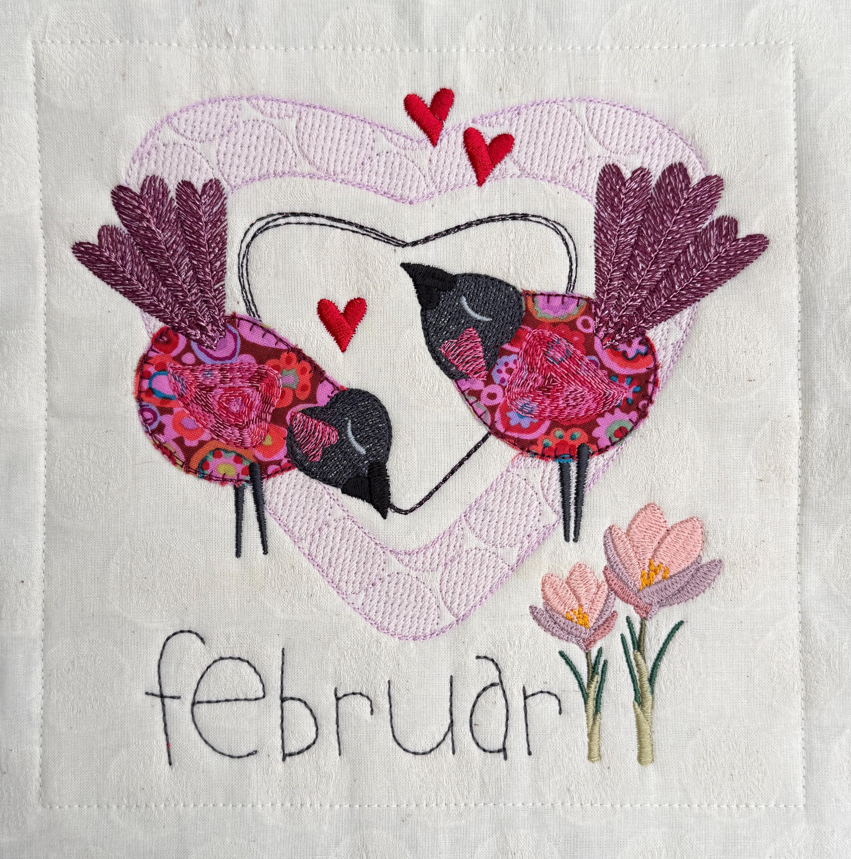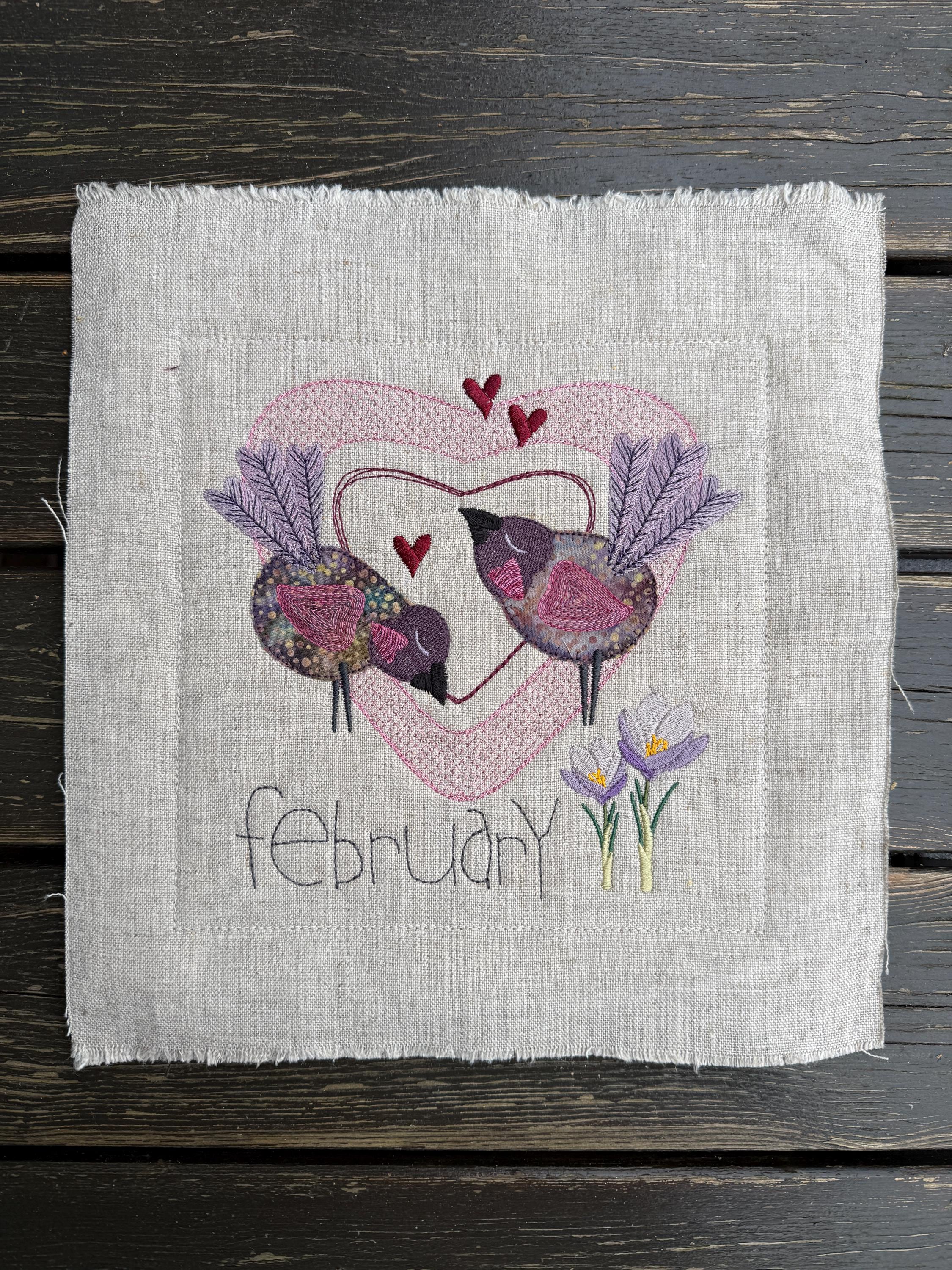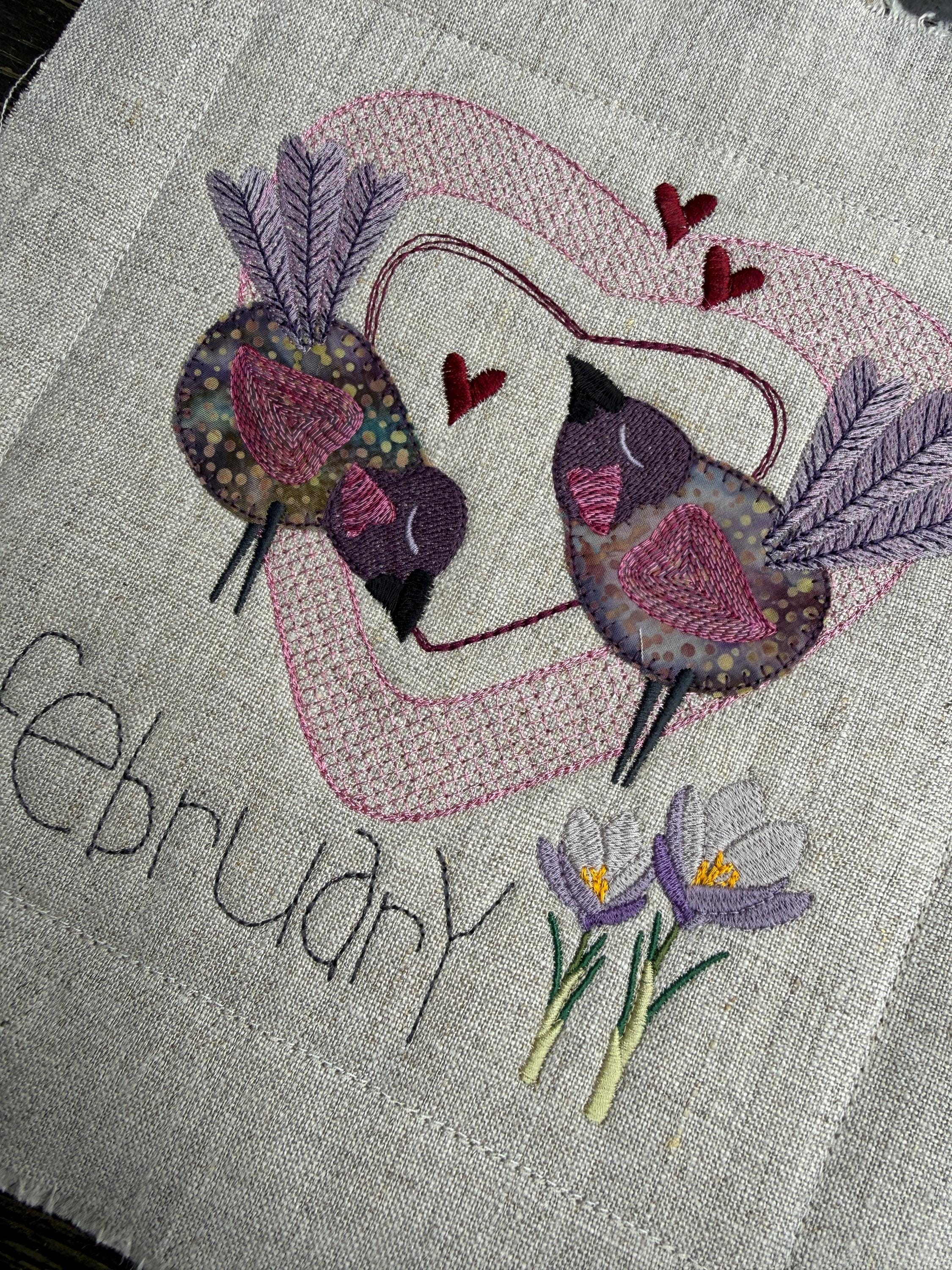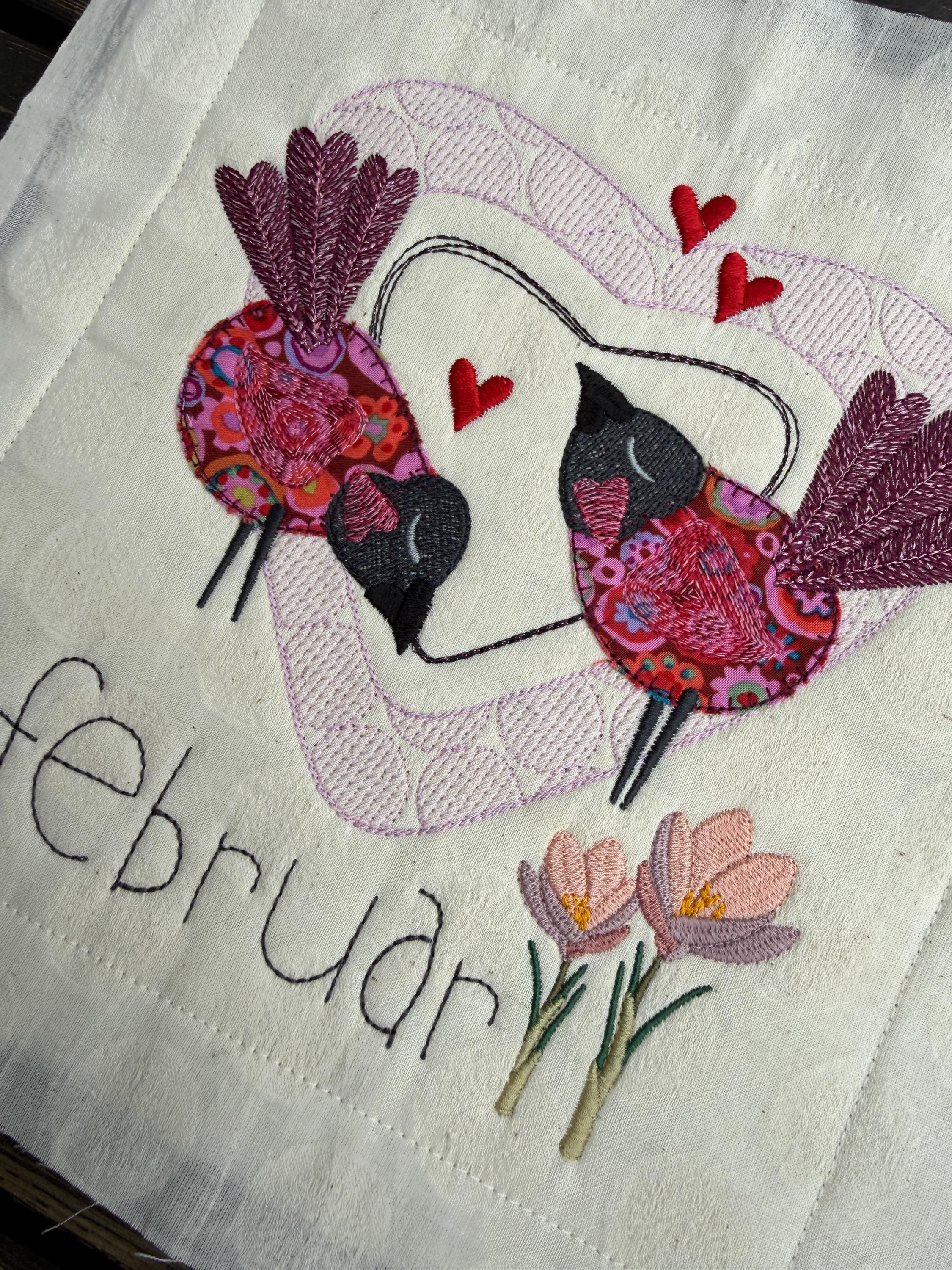 Monthly bird machine embroidery design featuring appliqué, quilt blocks, and ITH projects.
