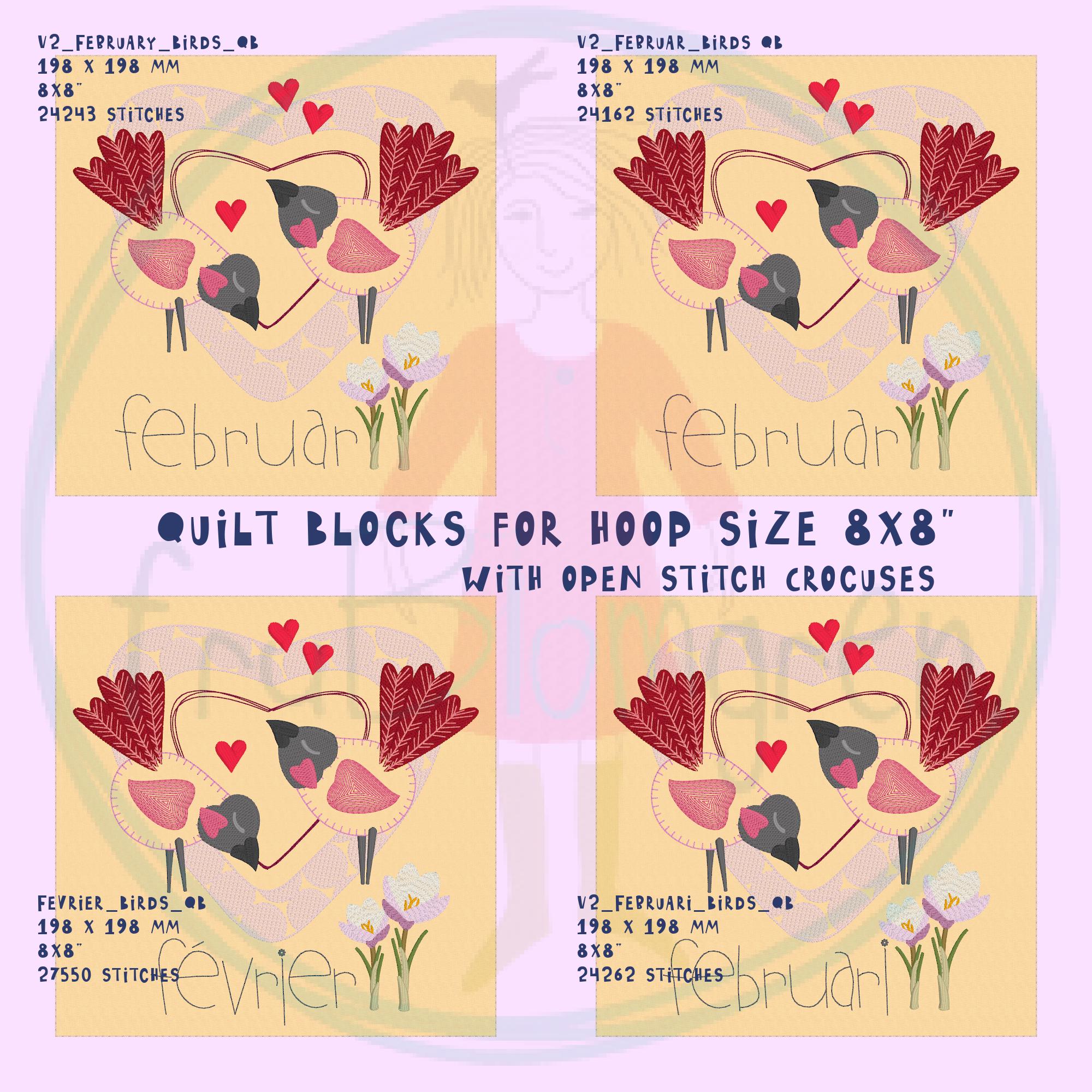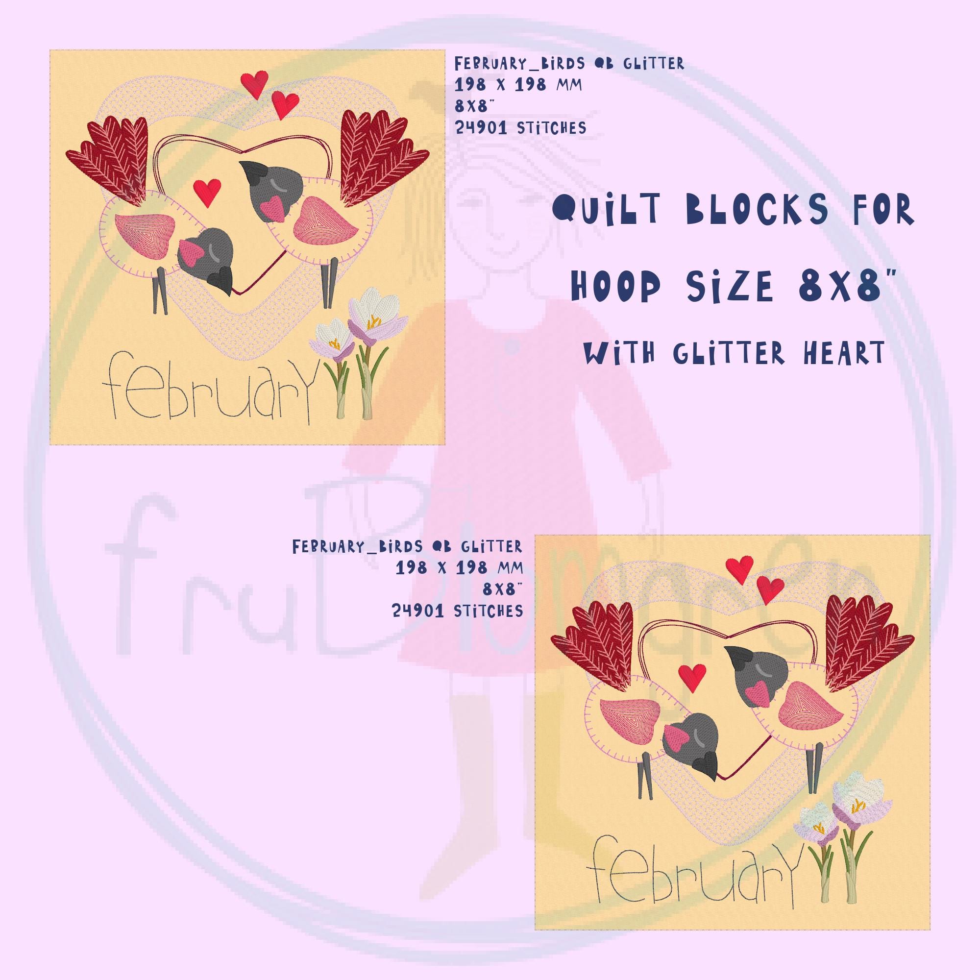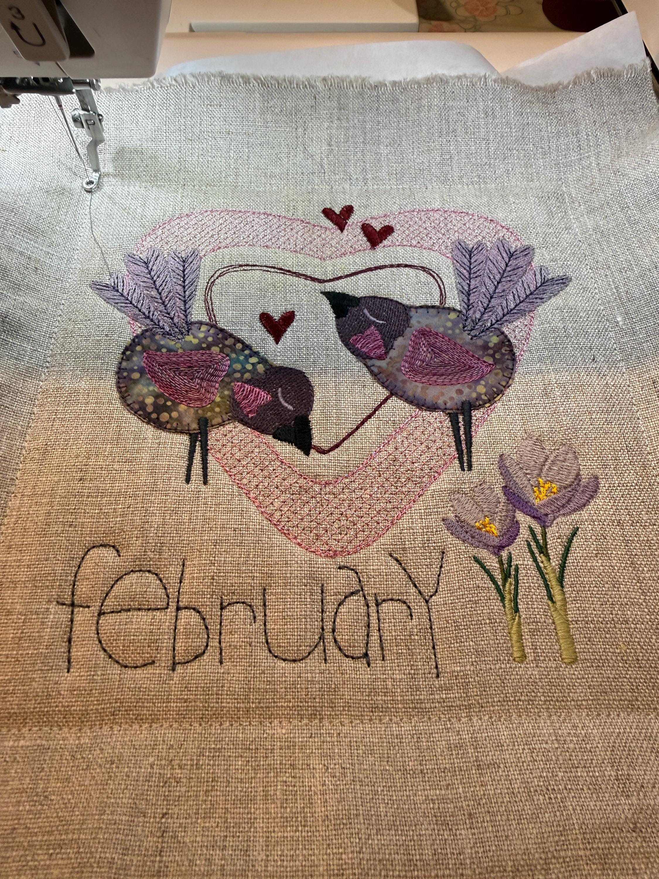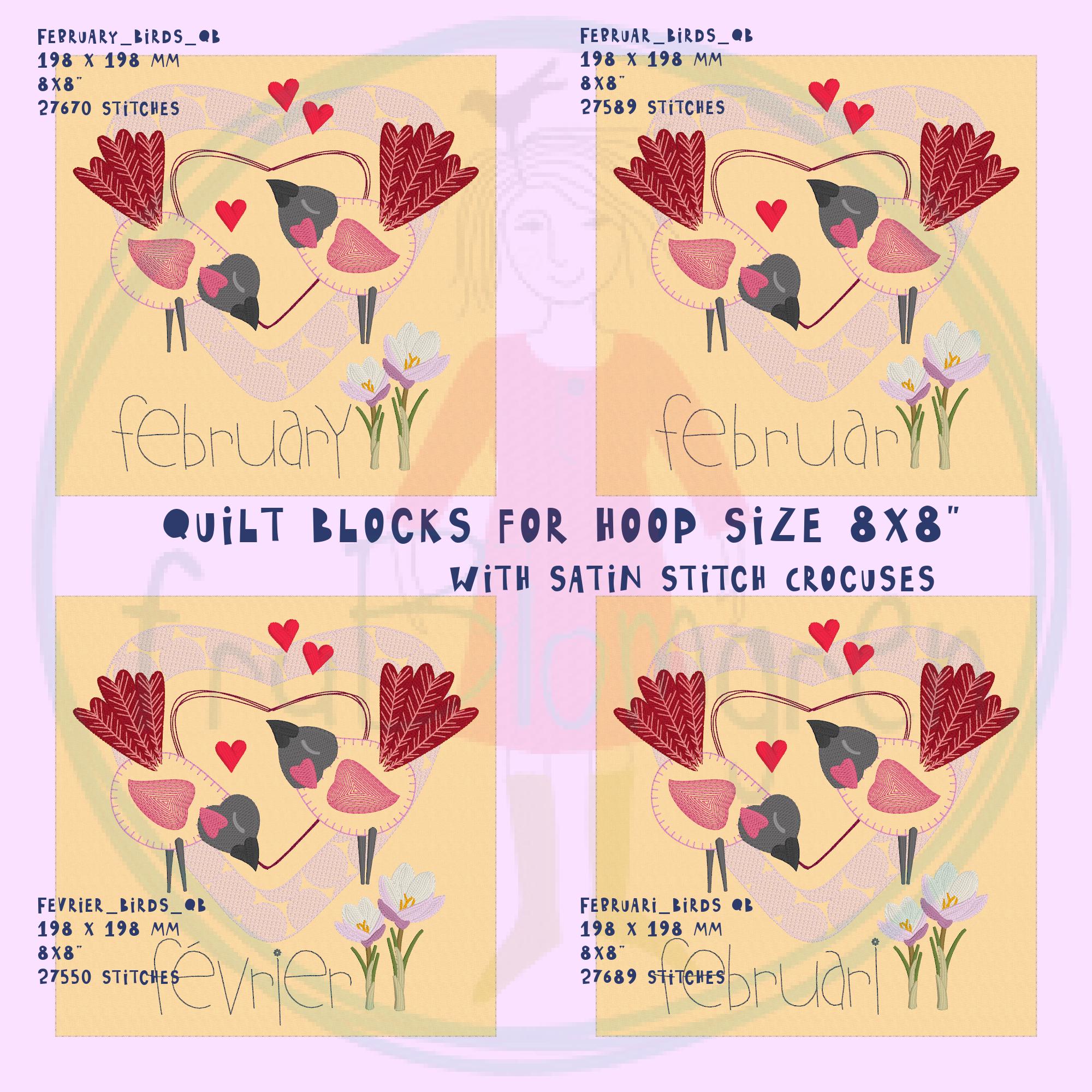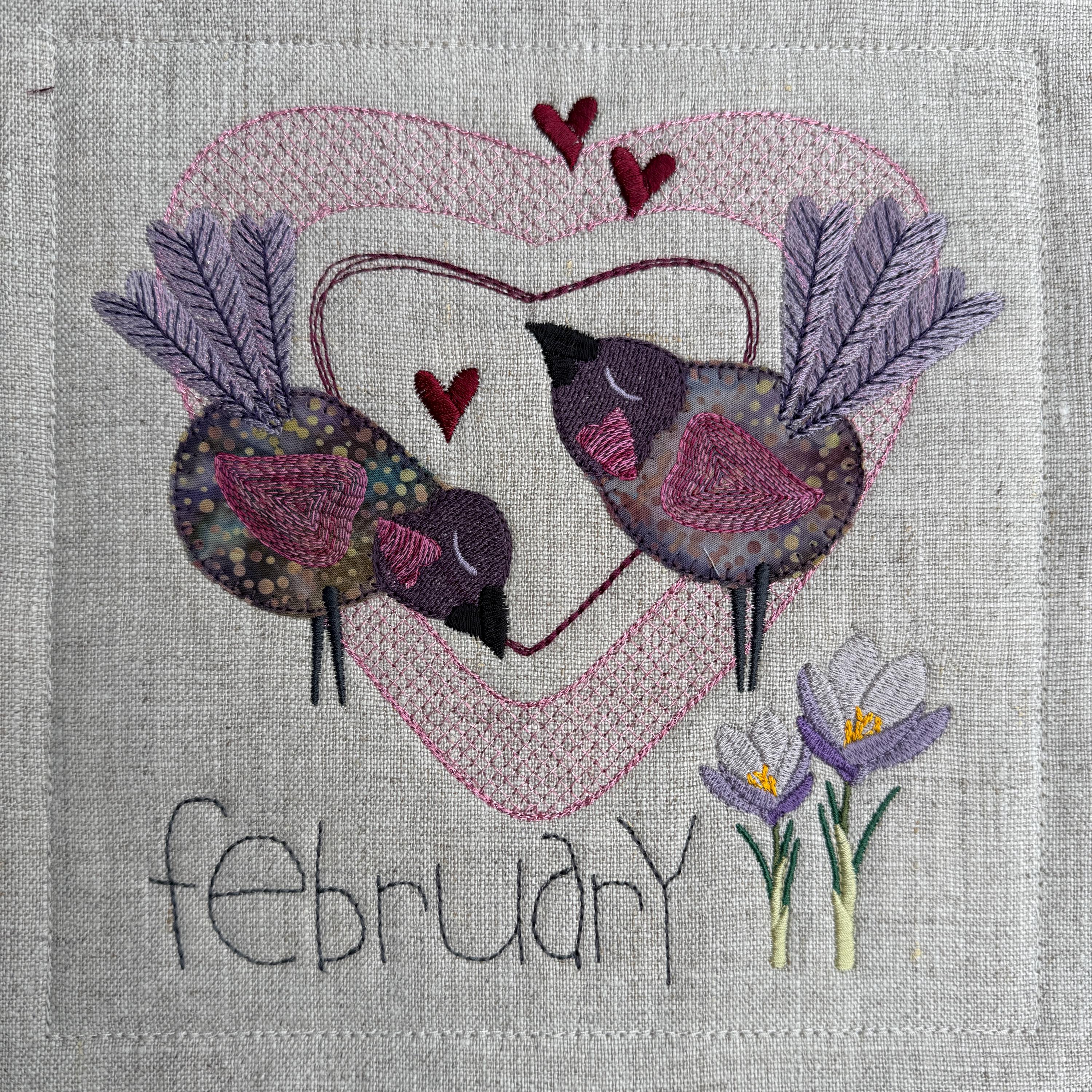 Monthly bird machine embroidery design featuring appliqué, quilt blocks, and ITH projects.
