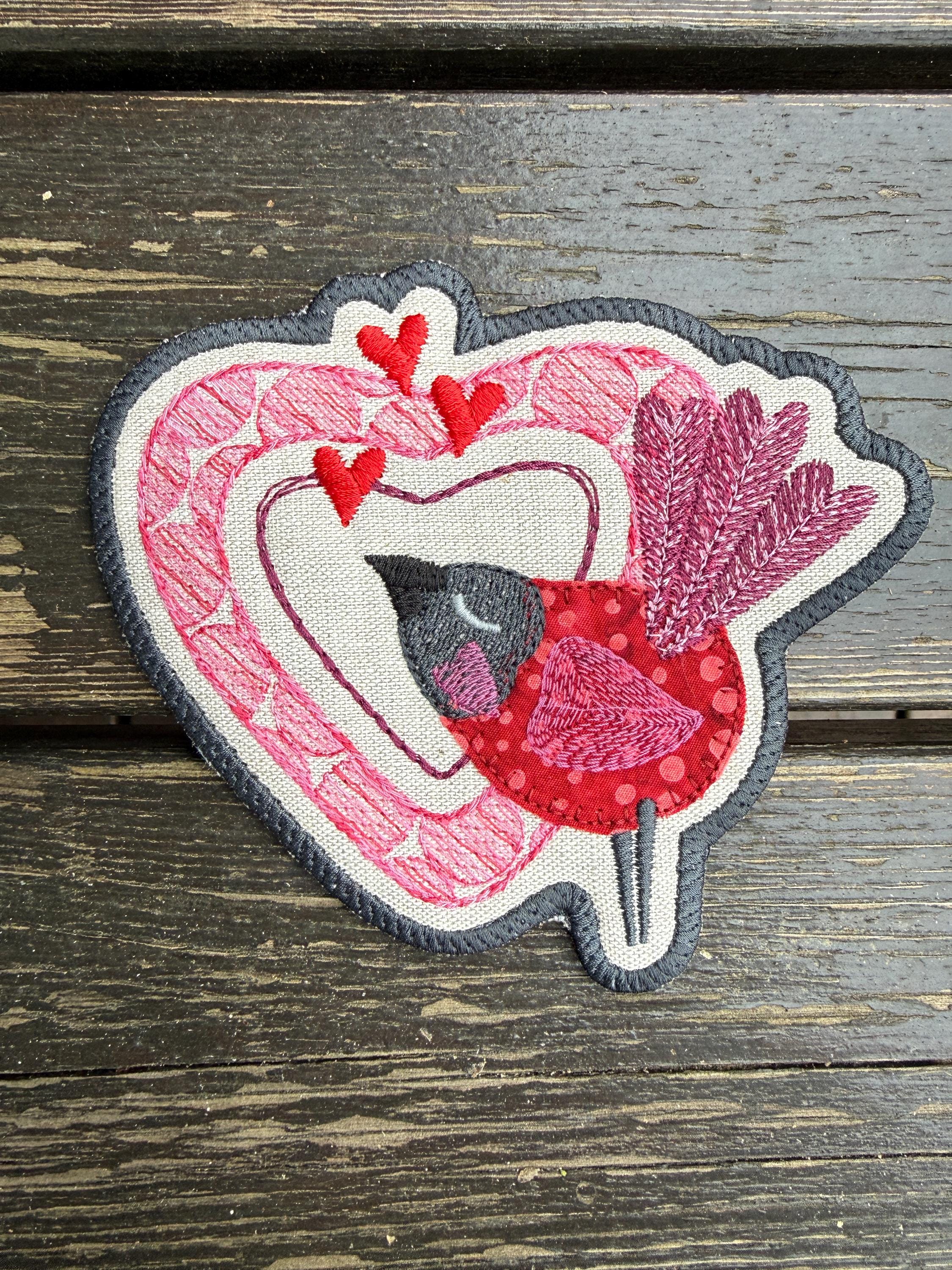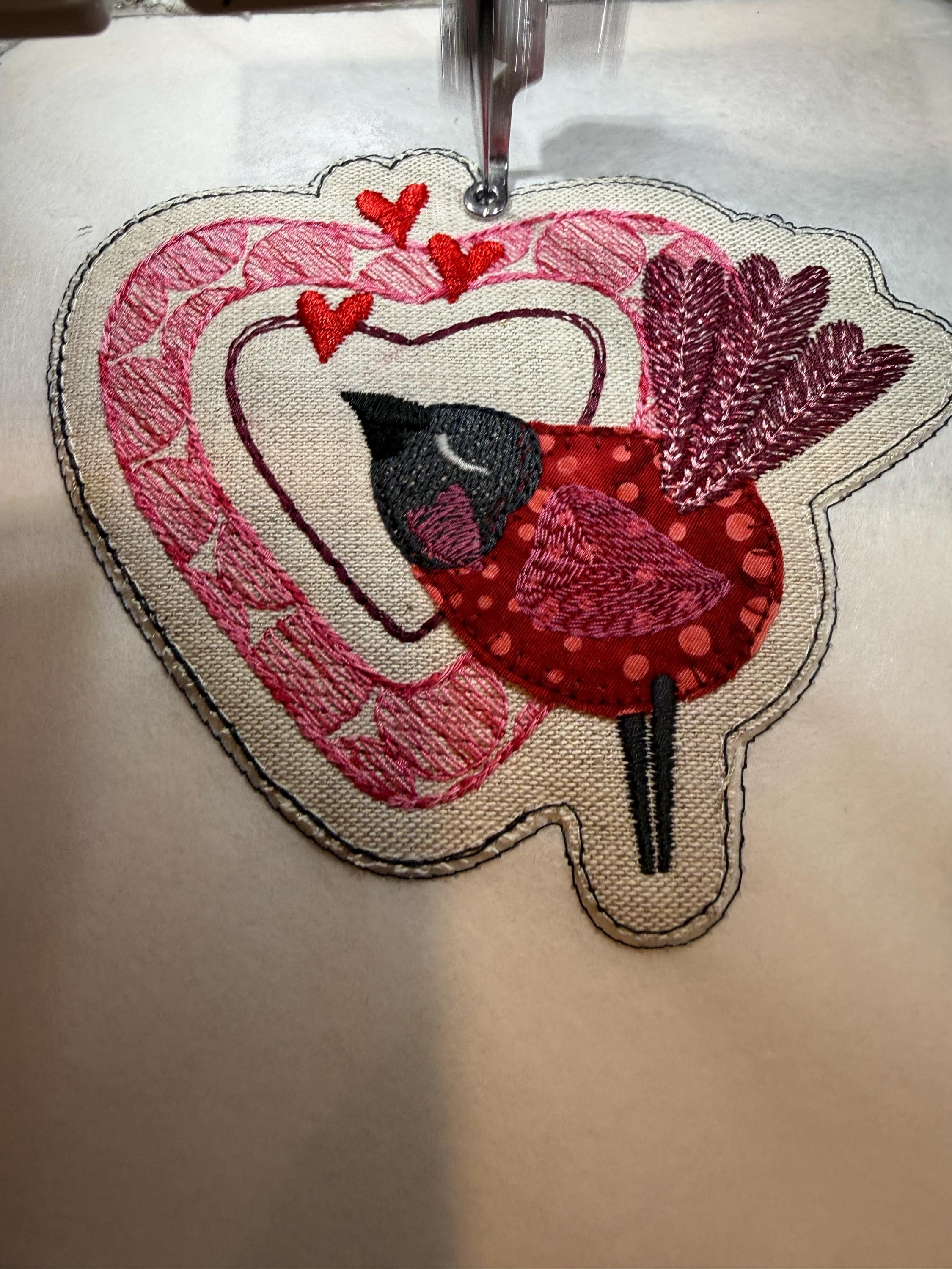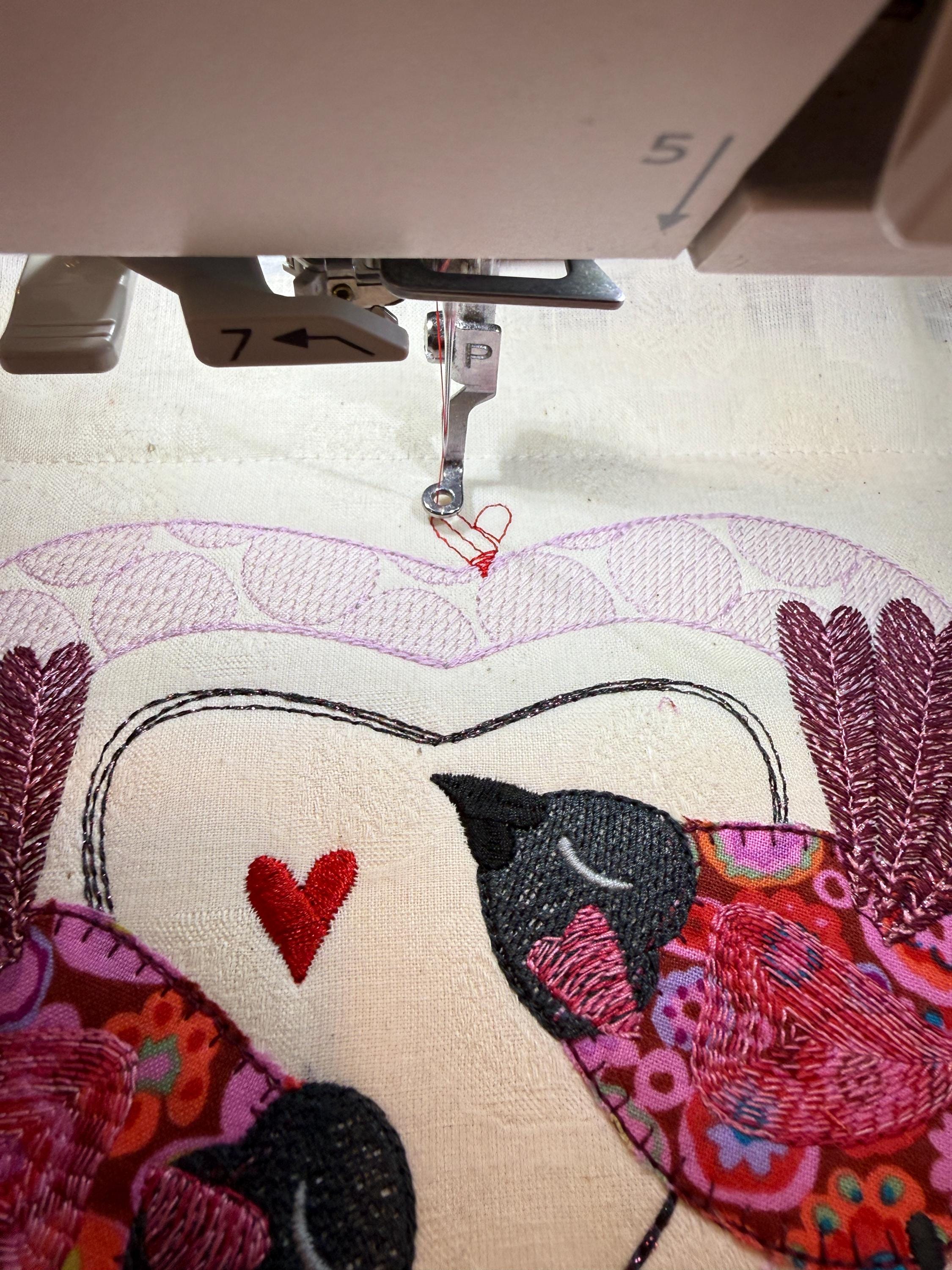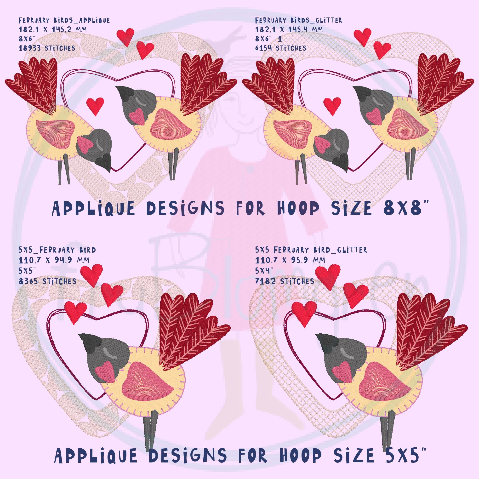 Monthly bird machine embroidery design featuring appliqué, quilt blocks, and ITH projects.