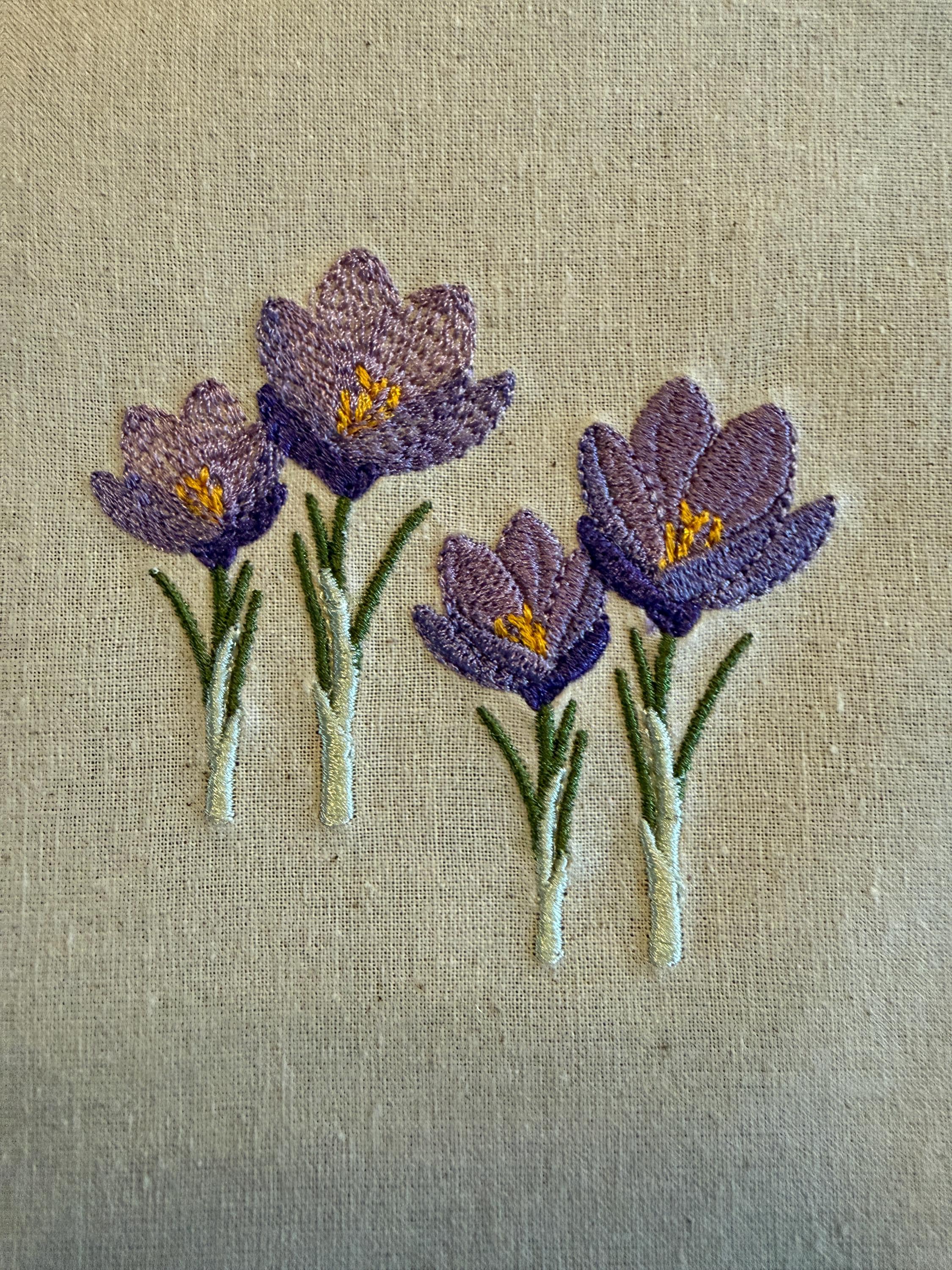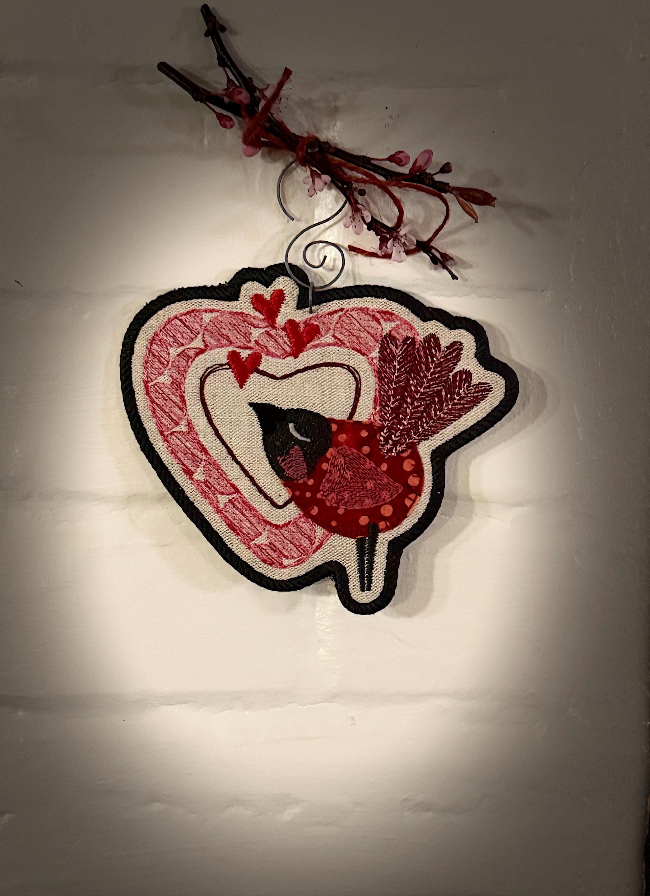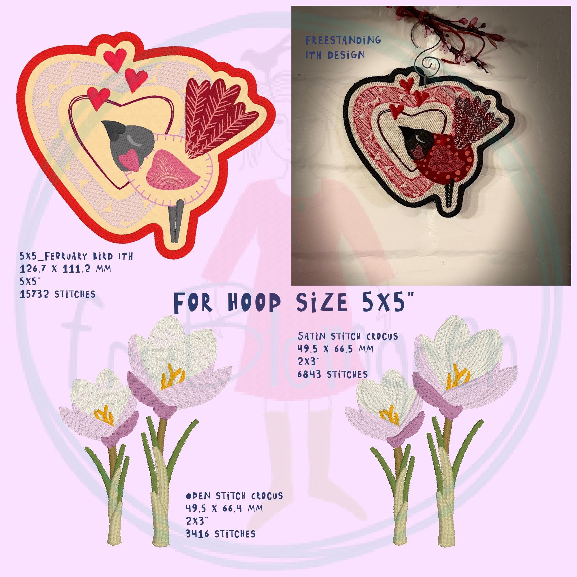 The February birds lean toward each other inside a gentle heart, inspired by Valentine’s warmth and winter’s quiet romance. Small crocuses bloom at their feet, pushing through the cold ground as one of the season’s first signs of hope.