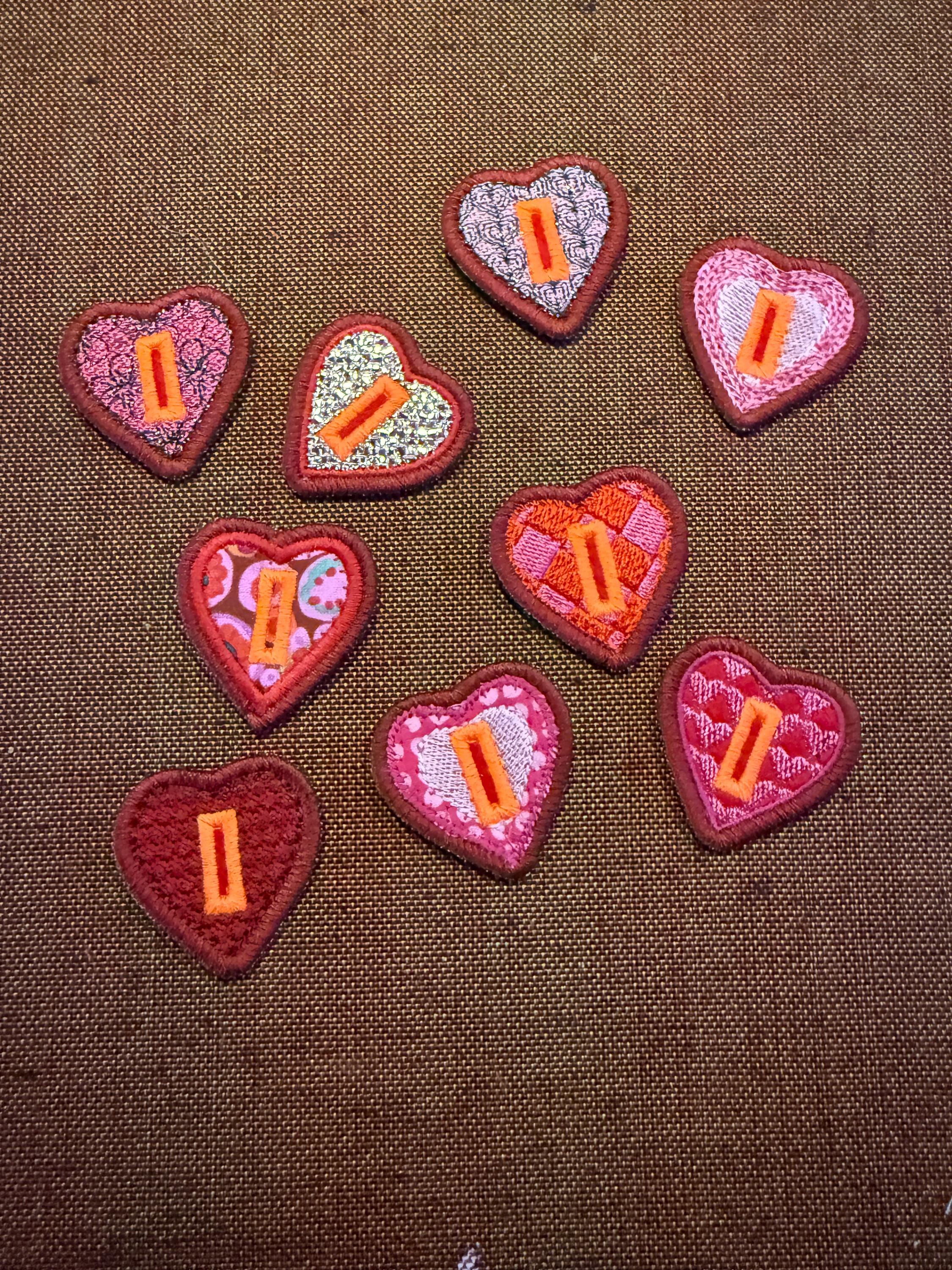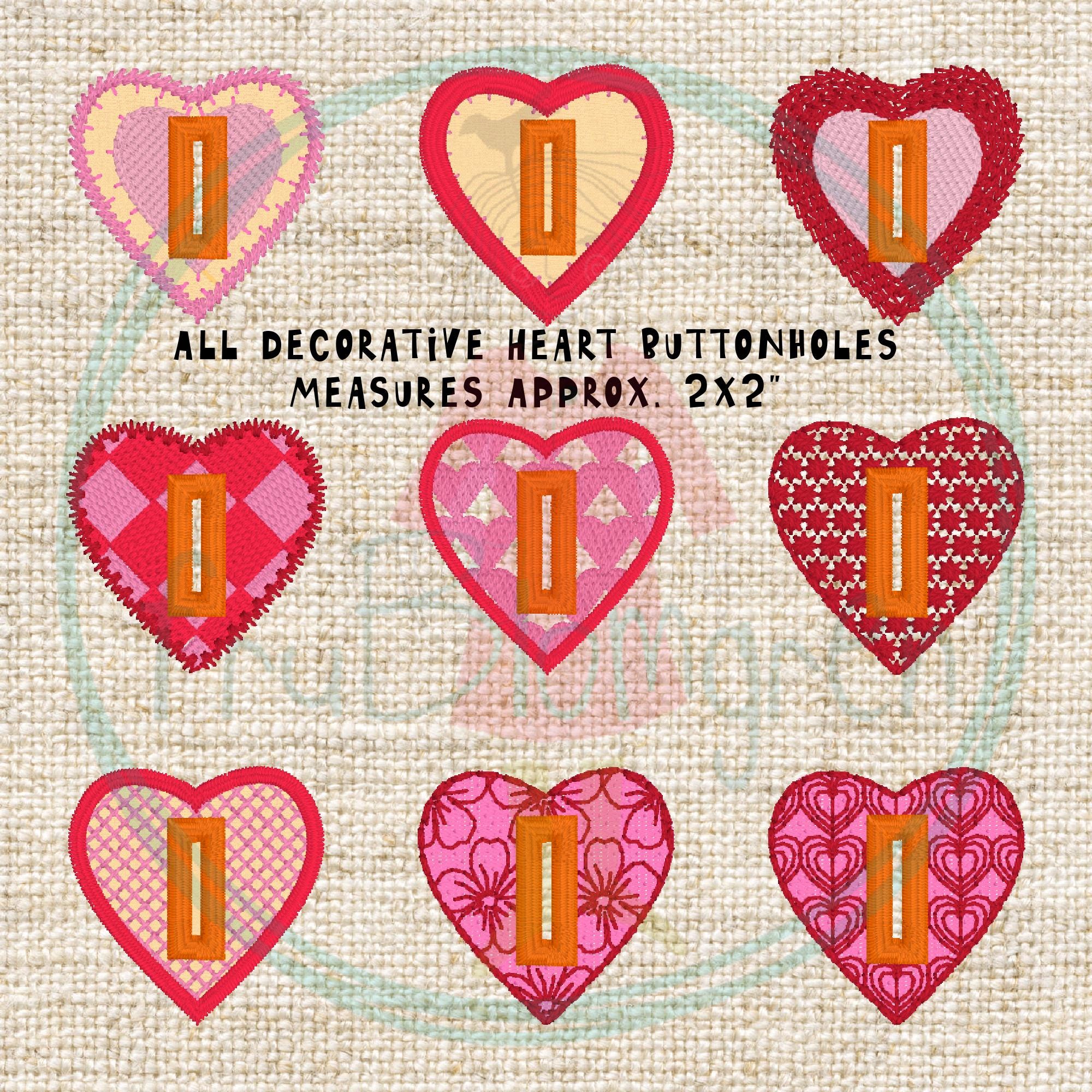 This design pack includes a collection of nine heart-shaped machine embroidered buttonholes, created as a functional extension of my decorative Fabric Buttons.