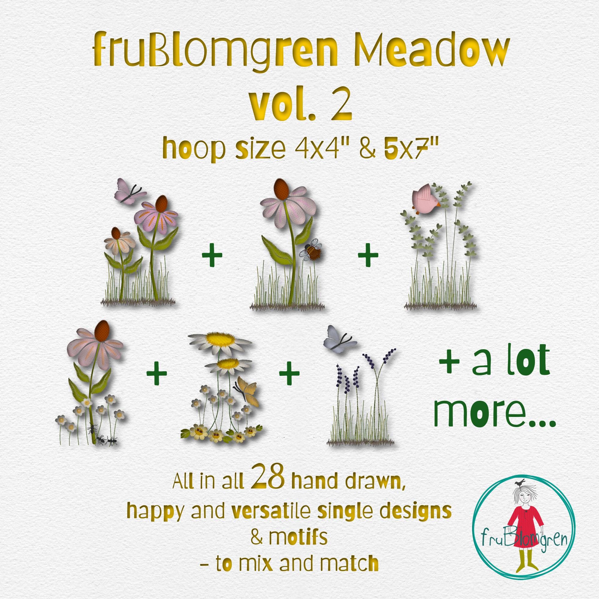 FruBlomgren Meadow Vol. 2 is a collection of hand-drawn, stylised floral machine embroidery designs – created to be mixed, matched, and combined into your own unique textile stories.