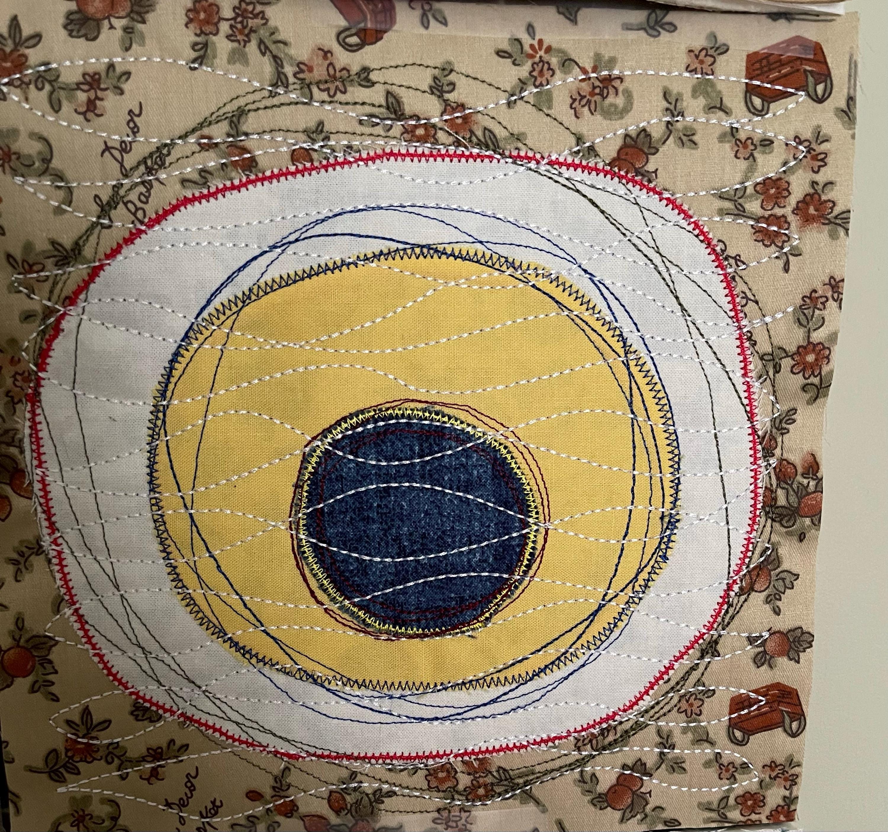 Applique circles - doodle art - application, zig-zag and running stitches made to look like hand stitching on a sewing machine - to embellish your textile/patchwork projects - make use of all your stash - the bits and pieces of awesome fabric that you do not want/can't to throw out. A machine embroidery design with endless variation possibilities and for multi purpose. (The last photo is a pocket ITH with the applique circles)