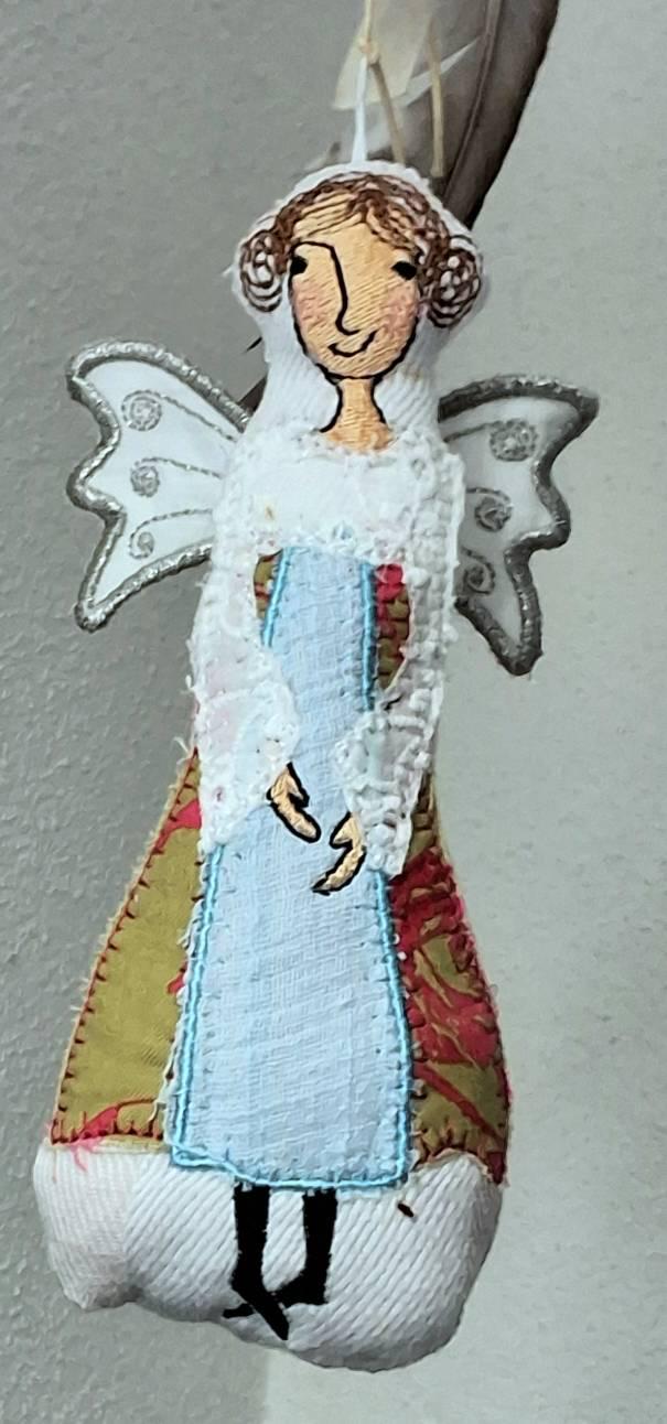 You get this darling angel doll, ITH, that is also an appliqué Machine Embroidery Design*) with a front and a back design, stitched in two hoopings PLUS 4 kinds of wings: Lace, Double-sided stippled for Mylar, Stippled quilted and Swirl design quilted.